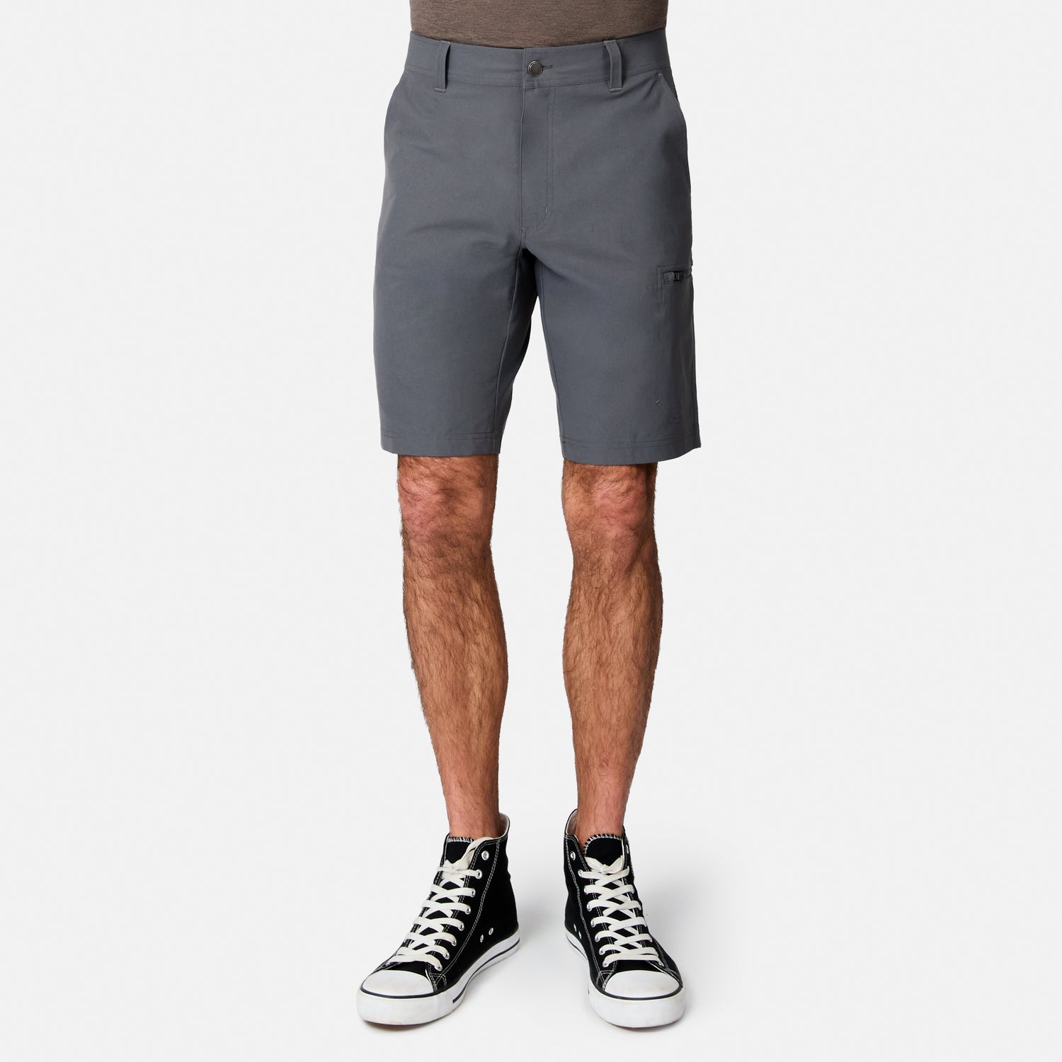 ![[Josiah is 6'3" wearing a size Medium.] Man wearing Free Country Men's Nylon Stretch Casual Short in Iron, size M, made from lightweight stretch performance fabric featuring a water repellent finish, slanted side pockets, and side leg zippered coin pocket, styled with a white t shirt and white shoes #color_iron](http://freecountry.com/cdn/shop/files/15MMAS5603IRON_2412_SS25-049-FC.jpg?v=1750705105&width=860)
