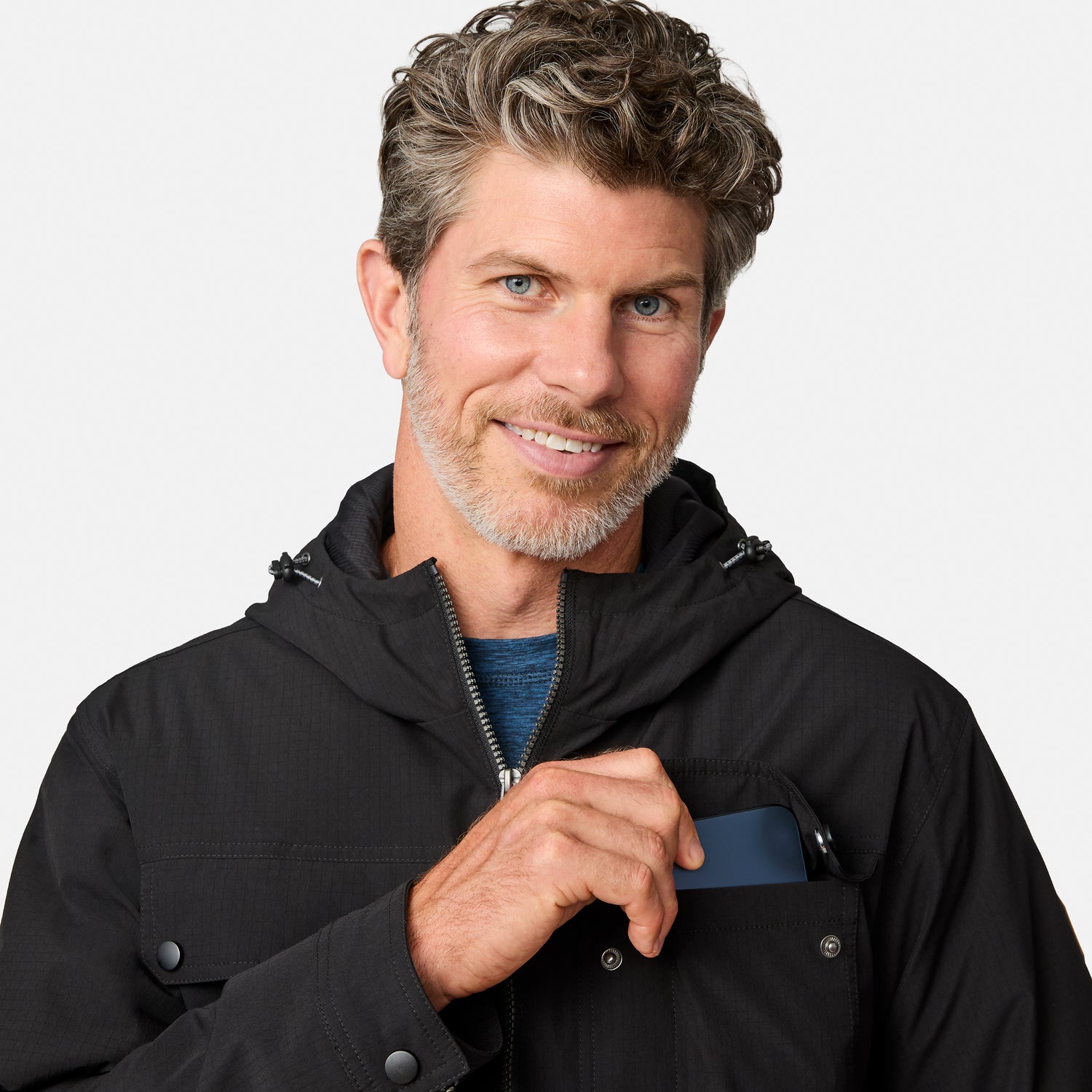 ![[Kolby is 6'2" wearing size M.] Men’s Free Country black hooded jacket with full-zip front, dual flap chest pockets, and button cuffs—featuring a clean silhouette and utility styling. Paired with brown pants for a rugged, cold-weather look that blends trail-ready function with everyday wearability.](http://freecountry.com/cdn/shop/files/548MOF5254_BLACK_191_FC.jpg?v=1753718936&width=860)
