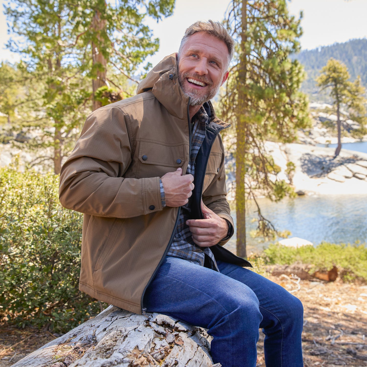 ![[Vince is 6’1” wearing size M.] Men’s Free Country brown hooded jacket with front zip closure and dual button-flap chest pockets. Worn over a charcoal tee and paired with blue jeans for a laid-back, utilitarian look that blends classic outerwear with everyday versatility.](http://freecountry.com/cdn/shop/files/548-MOF4254BARK_2406_FW24-006.jpg?v=1753718936&width=860)