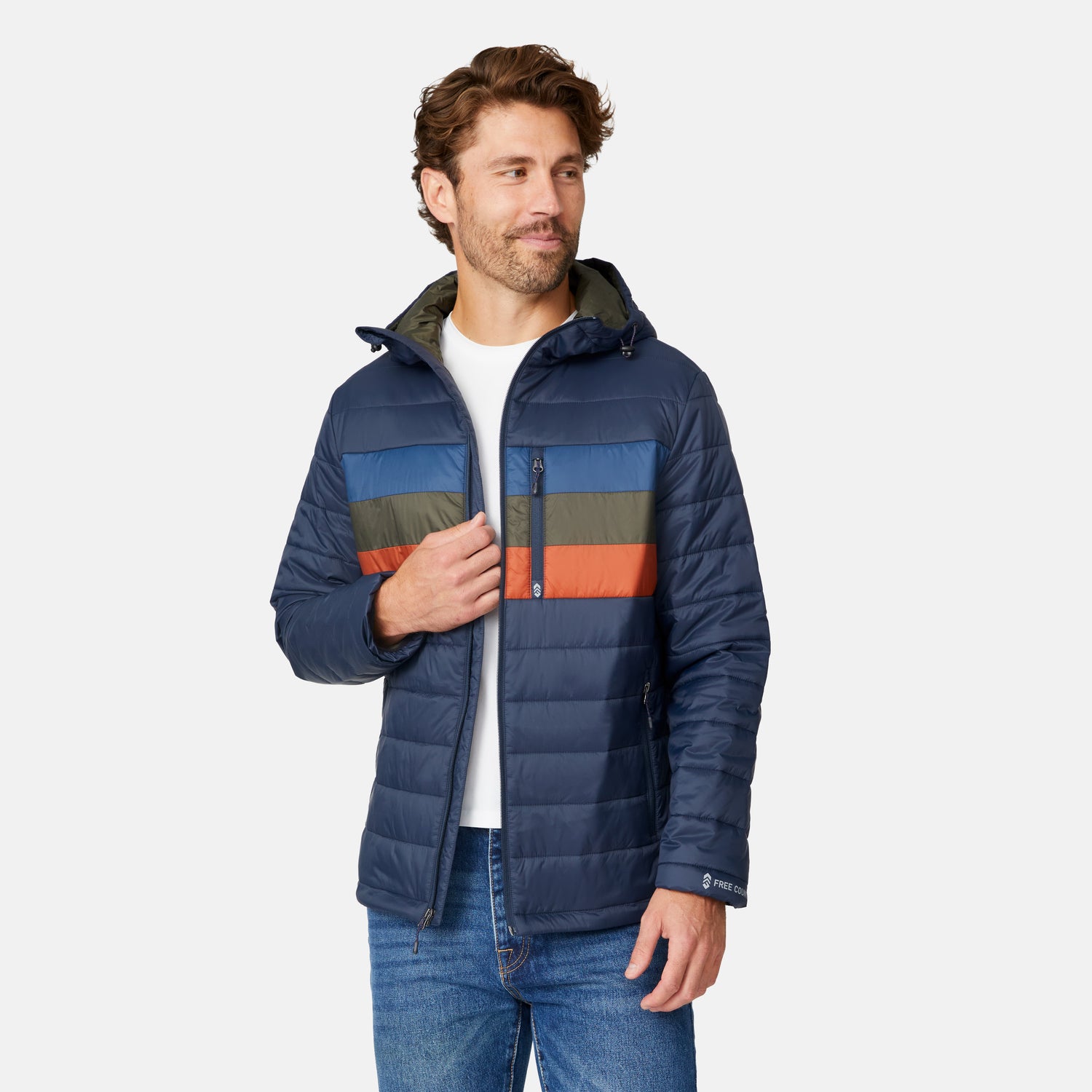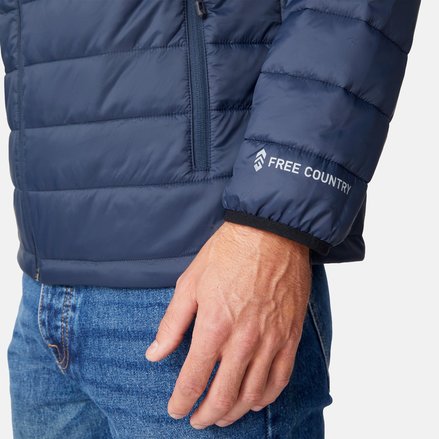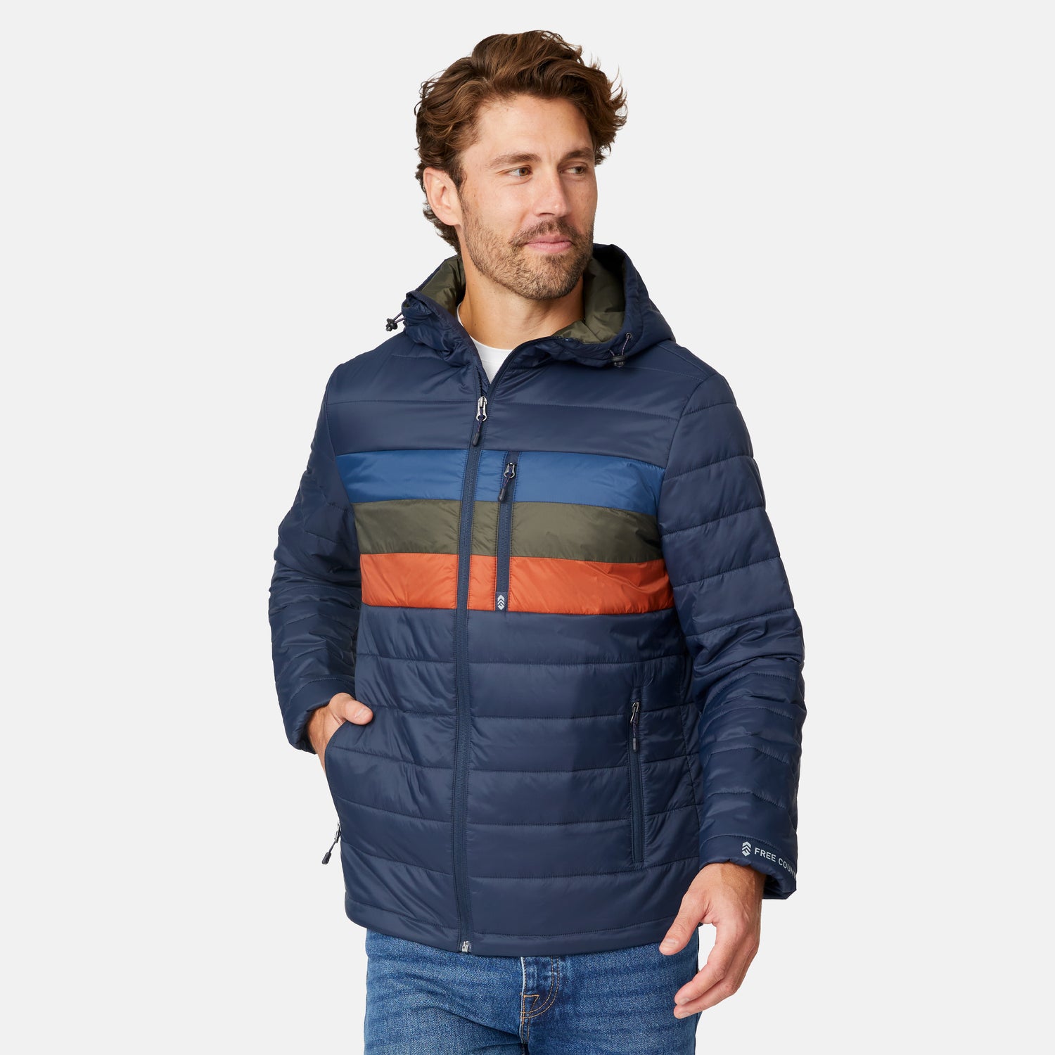 ![[Matt is 6'2" wearing size M.] Men’s Free Country zip-front puffer jacket in navy with multicolored horizontal chest stripes—featuring full-length zipper closure, insulated design, and classic hood-free silhouette. Paired with a white shirt and blue jeans for a vibrant, cold-weather look with retro-inspired flair.](http://freecountry.com/cdn/shop/files/75MOF5263_NAVY_2507_FW25-065_fC.jpg?v=1753213477&width=860)