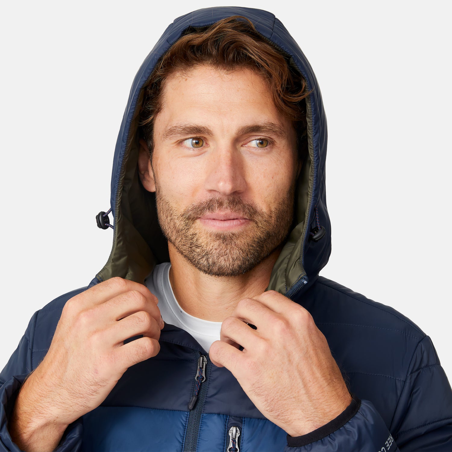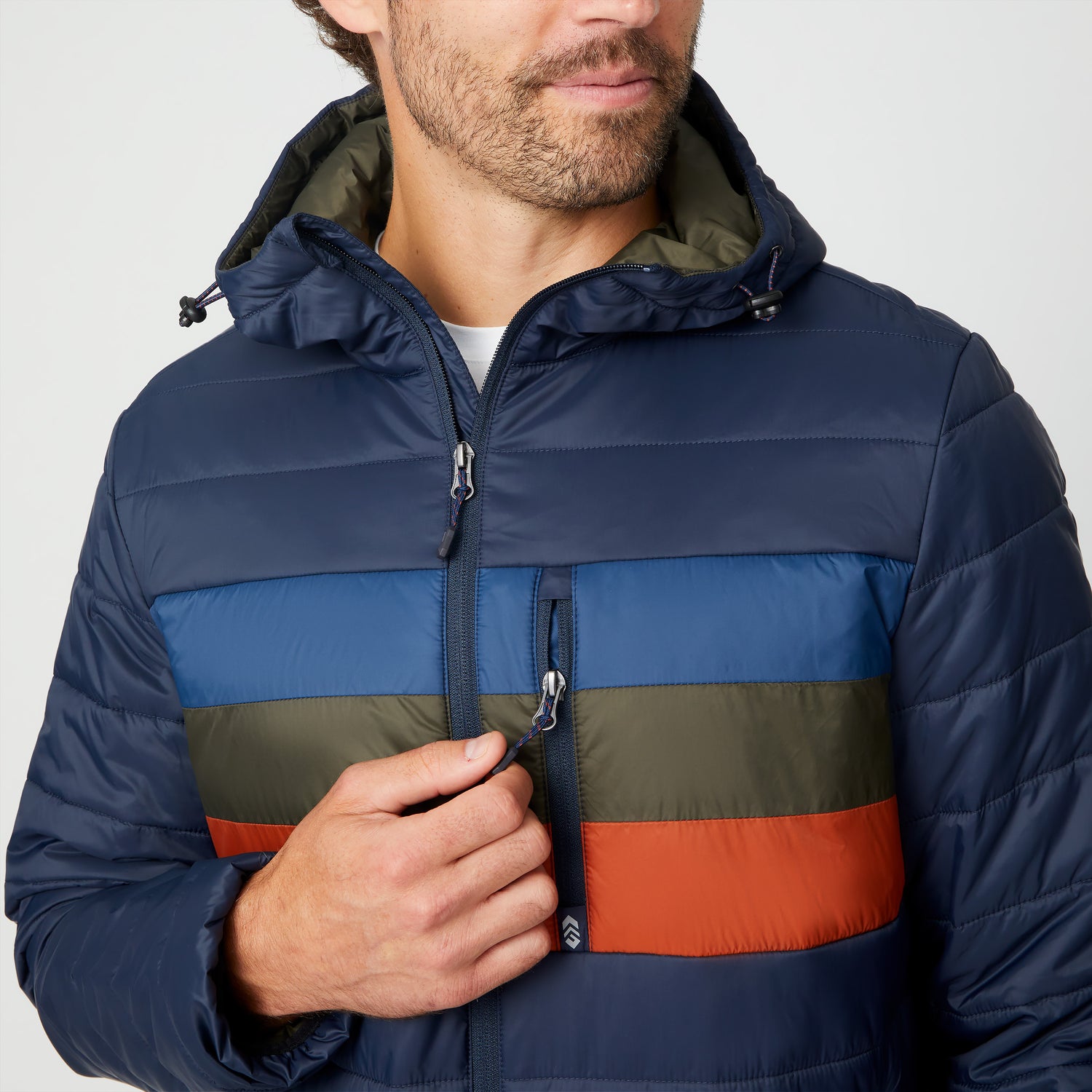 ![[Matt is 6'2" wearing size M.] Men’s Free Country zip-front puffer jacket in navy with multicolored horizontal chest stripes—featuring full-length zipper closure, insulated design, and classic hood-free silhouette. Paired with a white shirt and blue jeans for a vibrant, cold-weather look with retro-inspired flair.](http://freecountry.com/cdn/shop/files/75MOF5263_NAVY_2507_FW25-075_FC.jpg?v=1753213477&width=860)