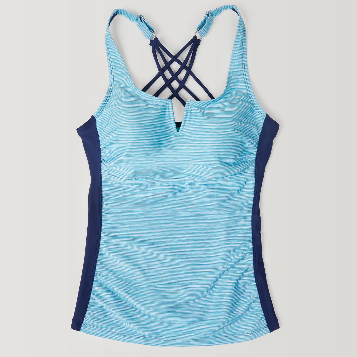 The Notch Front Tankini Top is your new warm-weather wingwoman, blending an eco-friendly design with sun-ready versatility. Made from a recycled polyester/spandex blend, this tankini is packed with performance features—without skimping on style. It boasts four-way stretch, quick-dry fabric and UPF 50+ protection to keep you cool, comfortable and covered. The flattering V-neckline and contrasting side panels with shirring details create sleek, confidence-boosting curves; while a built-in molded shelf bra and adjustable thick straps deliver lightweight support that stays put