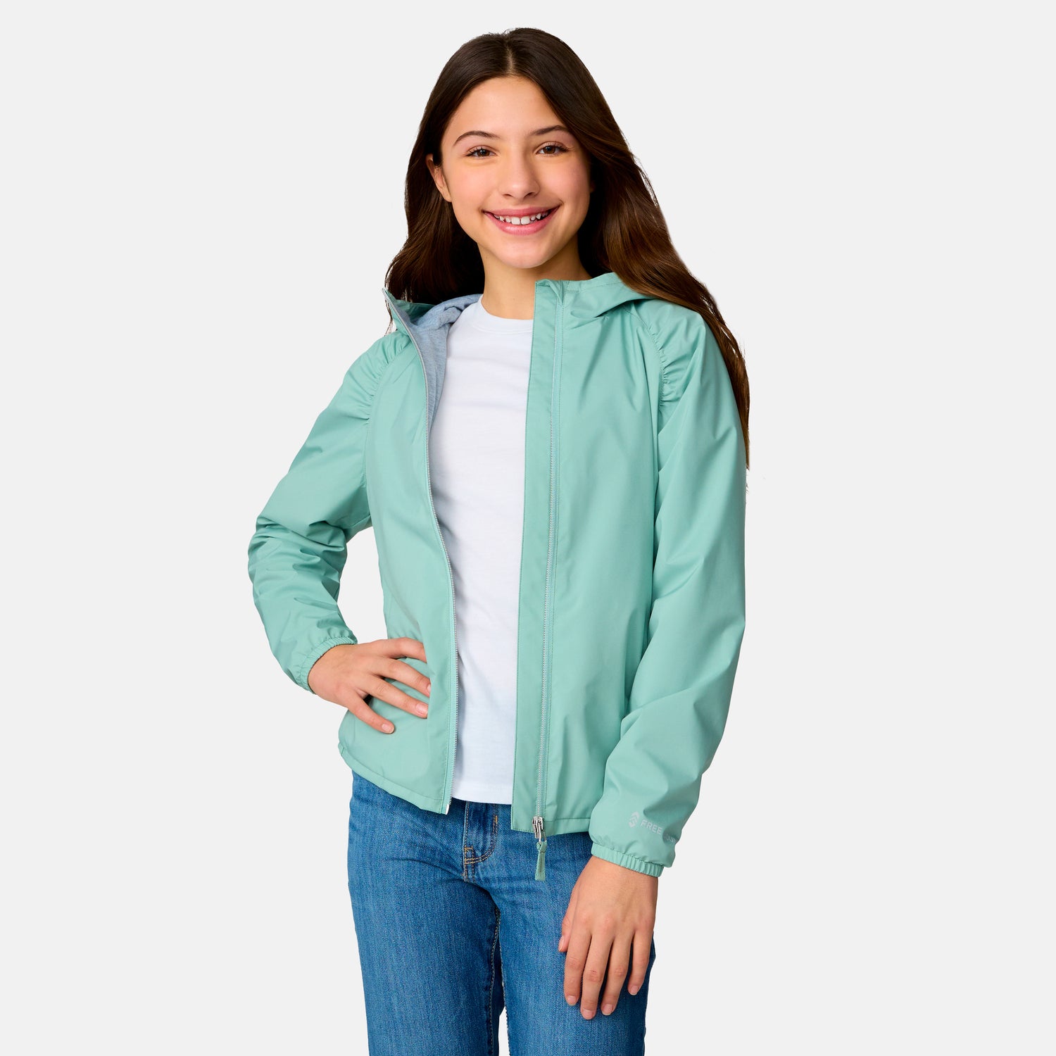 Shirred raglan sleeves enhance flexibility, whether she’s racing through the playground or exploring wooded trails. A full-length zipper with a storm placket and chin guard seals out drafts and drips, and zippered pockets secure small treasures or snacks. With an attached hood that stays put in breezy conditions, this jacket is the ultimate grab-and-go essential.