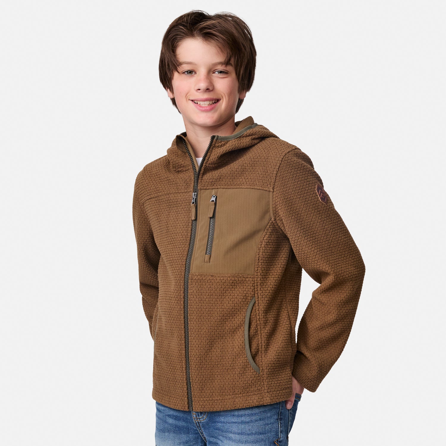 From hiking to hanging out, let your little guy embrace the chill in style with this super-soft hoodie. Crafted from double-faced brick fleece, this jacket delivers lightweight warmth and superior comfort. With an attached hood, front pockets and matte stretch binding, it's ready to keep up with all-day play. Plus, a ripstop fabric chest pocket with a zipper closure adds a cool, functional touch. Machine washable and designed for durability, it’s the perfect go-to layer for active days and outdoor adventures.