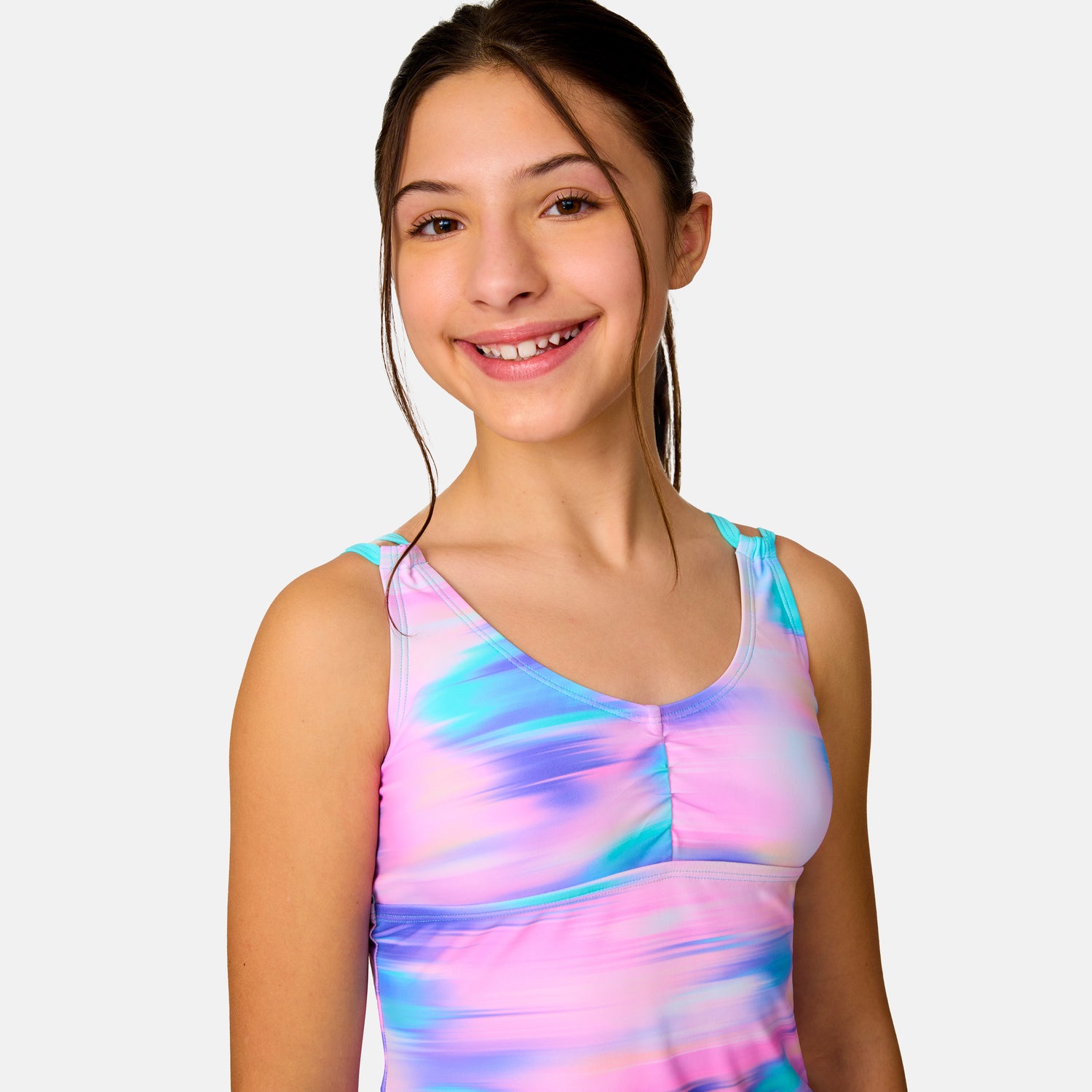 Make a splash in our newest sun-smart swim set! This dreamy watercolor design is as fun as a summer sunset, and a recycled polyester fabric delivers UPF 50+ protection for worry-free play under the sun. The four-way stretch fabric moves with her as she conquers waves, builds sandcastles or perfects her dive—no tugging, no restrictions.