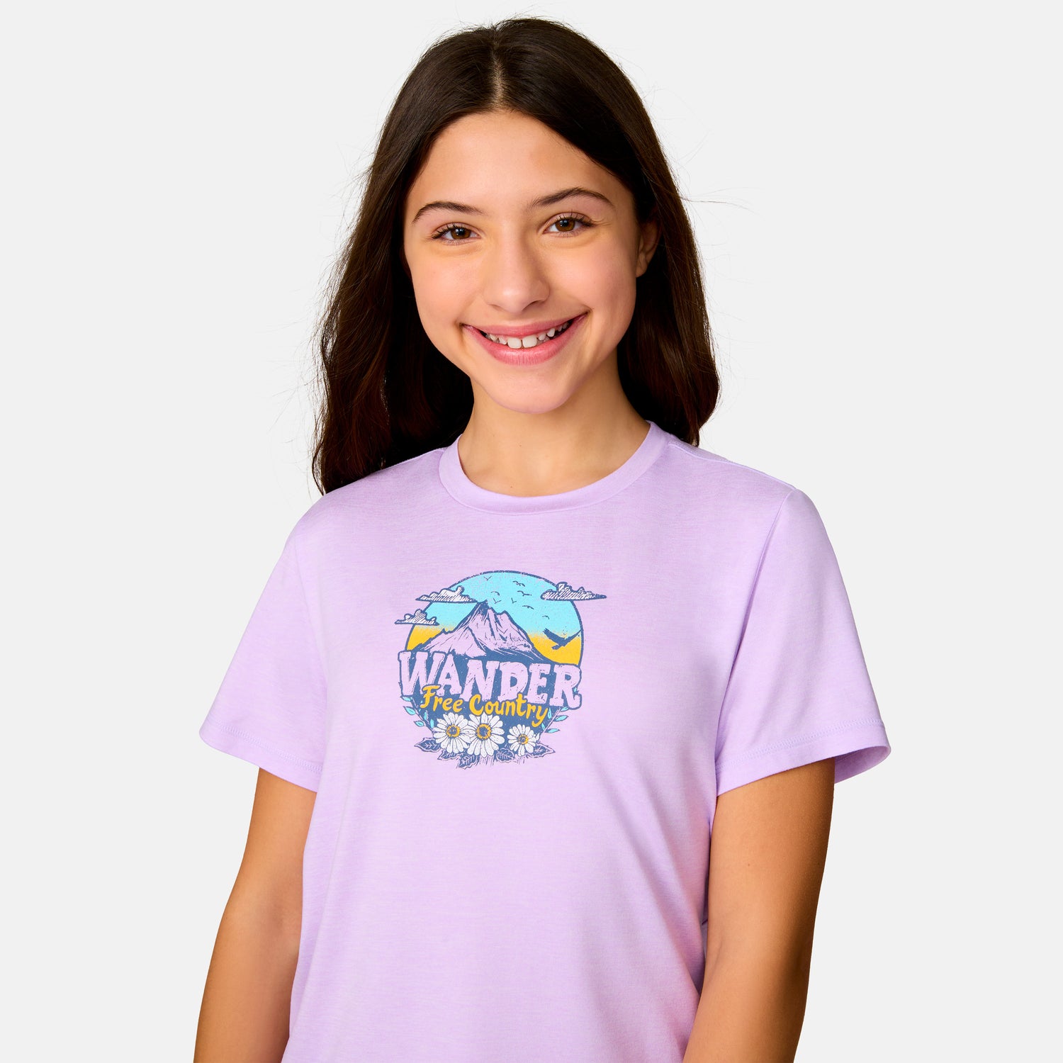 ![[Model is wearing a size Medium.] Girl wearing the Free Country Girls’ Microtech® Graphic Crew Neck Shirt in Lavender, size M, featuring lightweight odor free fabric and upf protection, paired with blue jeans #color_ lavender](http://freecountry.com/cdn/shop/files/15LKAS5400_Lavender_SS25-FC-PDP_2.jpg?v=1750695684&width=860)
