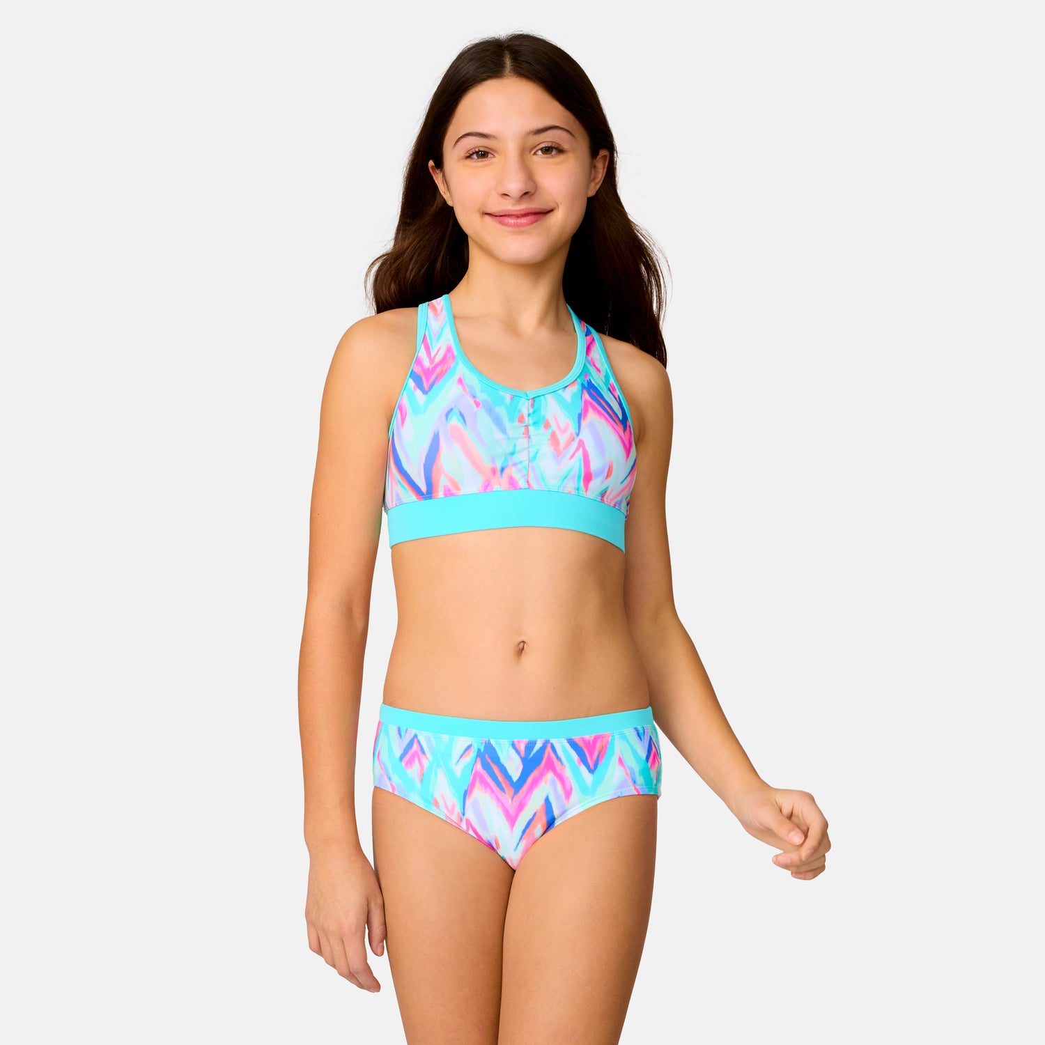 ![[Model is wearing a size Medium.] Girl wearing the Free Country Girls' Fresco Rash Guard and Bikini Swim Set in Aquatopia Oasis Chevron, size M, featuring a raglan sleeve rash guard and racerback tankini top and lined bikini bottom made from recycled polyester fabric that provides four way stretch and upf protection #color_ Aquatopia-Oasis-Chevron](http://freecountry.com/cdn/shop/files/SRGSS5200__Aquatopia-Oasis-Chevron__SS25-FC-PDP_3.jpg?v=1751387385&width=860)