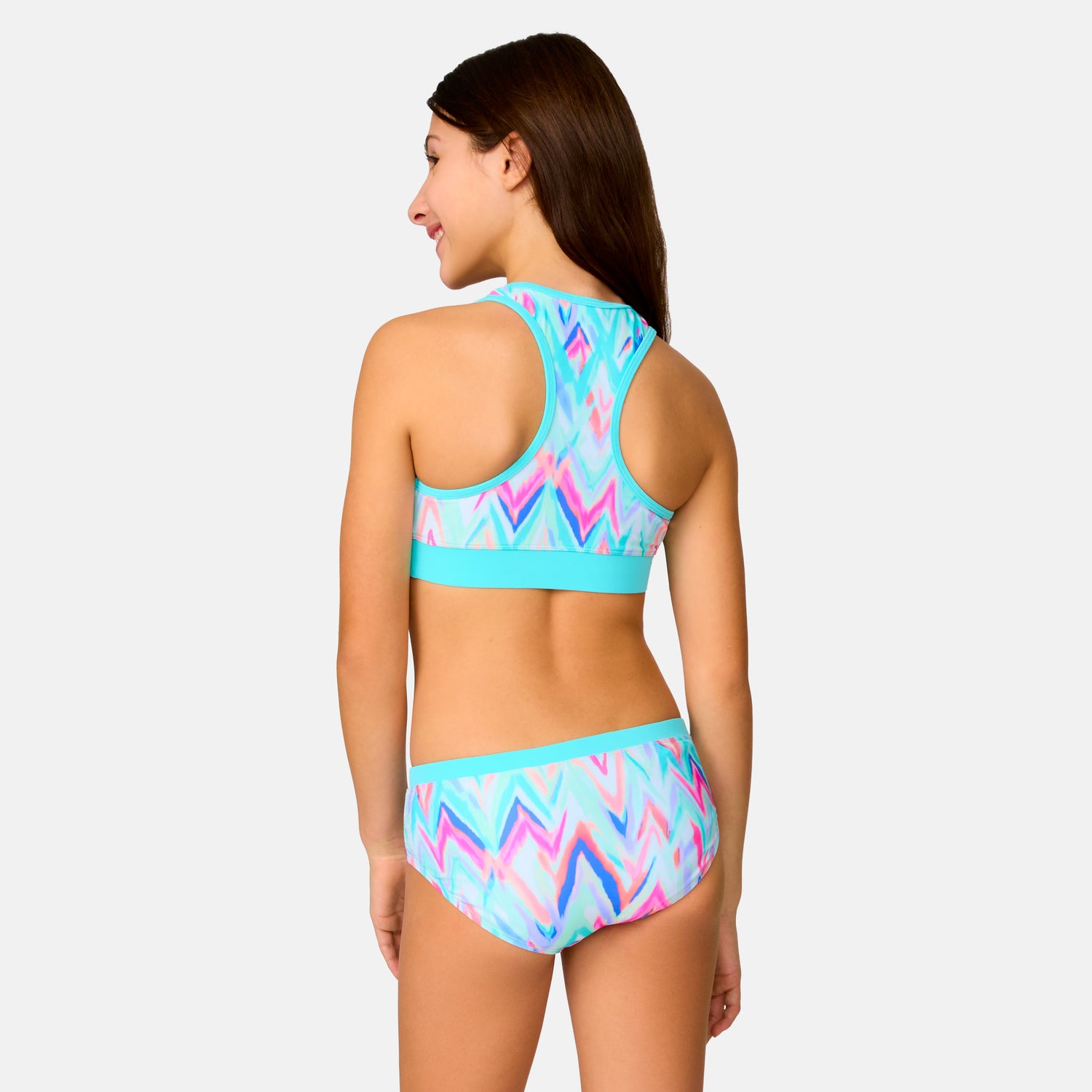 ![[Model is wearing a size Medium.] Girl wearing the Free Country Girls' Fresco Rash Guard and Bikini Swim Set in Aquatopia Oasis Chevron, size M, featuring a raglan sleeve rash guard and racerback tankini top and lined bikini bottom made from recycled polyester fabric that provides four way stretch and upf protection #color_ Aquatopia-Oasis-Chevron](http://freecountry.com/cdn/shop/files/SRGSS5200__Aquatopia-Oasis-Chevron__SS25-FC-PDP_5.jpg?v=1751387415&width=860)
