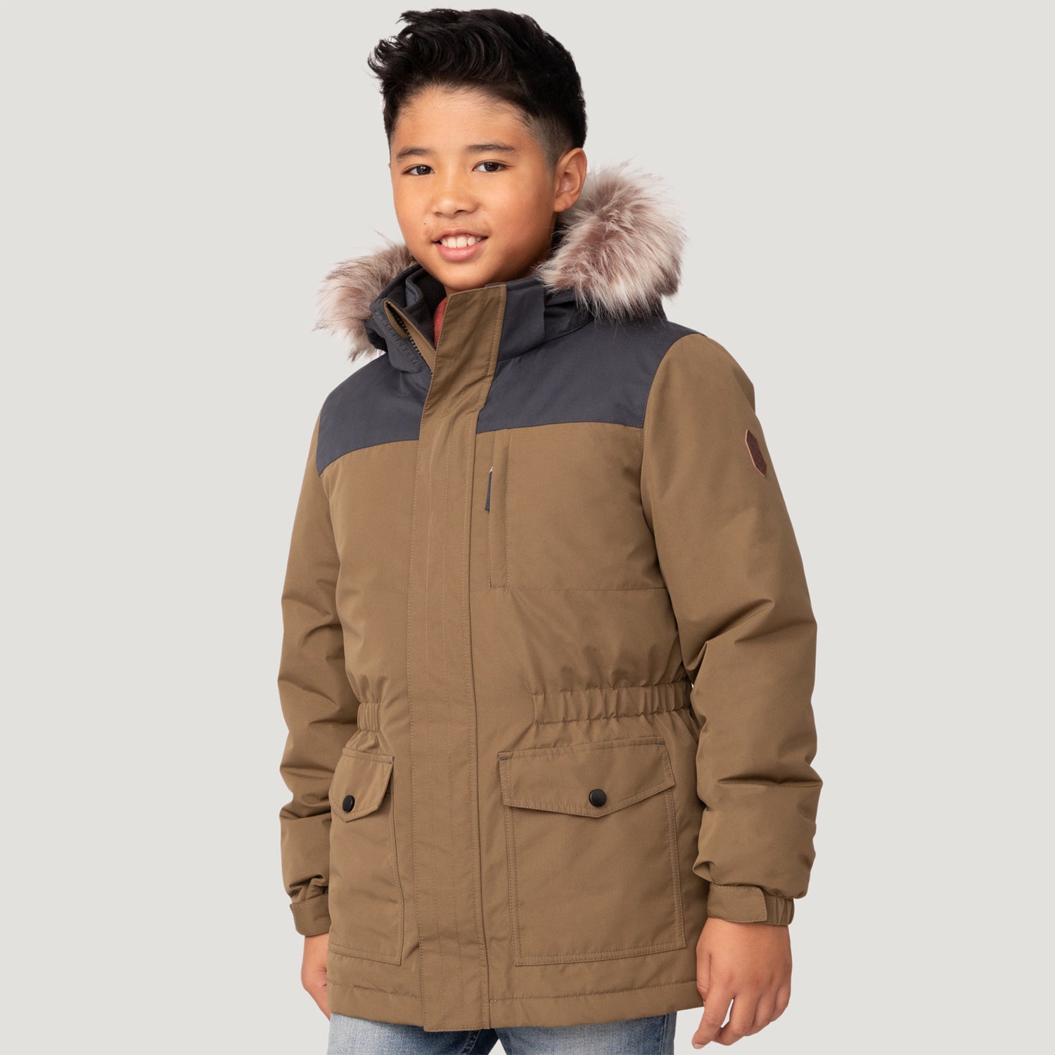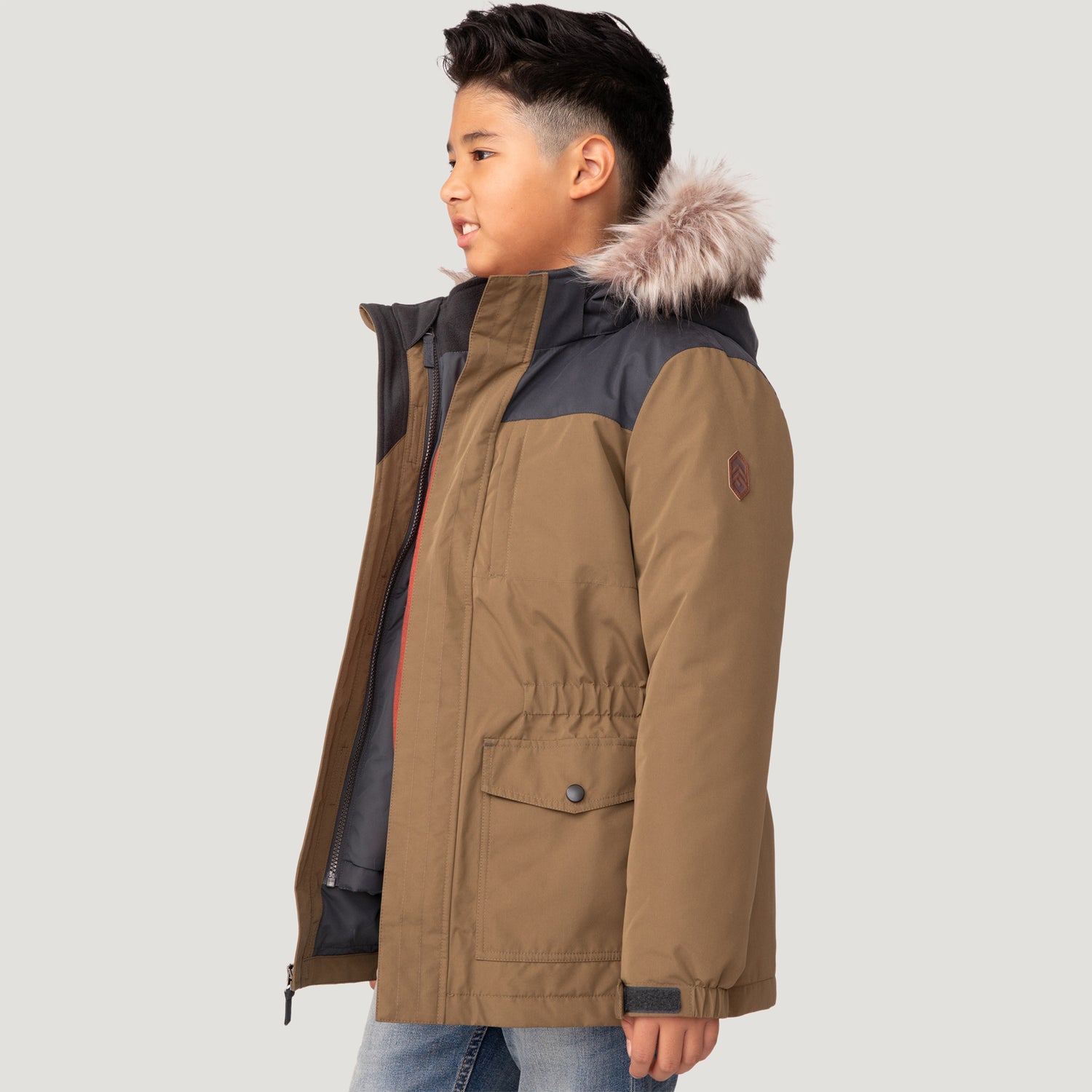 ![[Model is wearing a size Medium.] Young boy wearing the Free Country Boys' Parka Jacket in dark color with a hood and subtle chest pattern, smiling against a plain background.](http://freecountry.com/cdn/shop/files/154-BOF4301BARK_2408_FW24-108.jpg?v=1743450058&width=860)