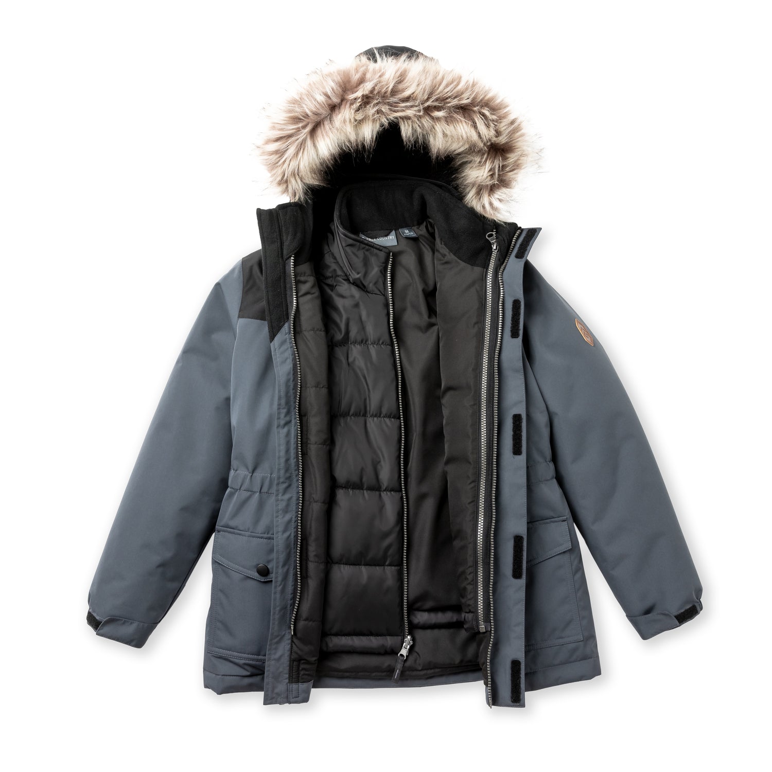 Meet the Boys' 3-in-1 Systems Parka Jacket—the ultimate weather warrior! This innovative jacket lets him conquer any forecast with its zip-in, zip-off design. A durable PVC-coated polyester shell boasts water and wind resistance, a stylish faux fur-trimmed hood, adjustable Velcro wrist closures and a full zip front with a storm placket to keep the elements at bay.