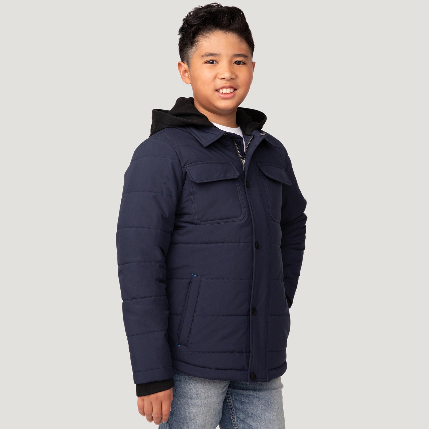 The Boys' Puffer Hoodie Shacket is the ultimate mashup of cozy, cool and functional. This hybrid piece combines the warmth of a puffer, the comfort of a hoodie and the laid-back vibe of a shirt-jacket. This all-in-one layer is crafted from eco-friendly fabric and packed with REPREVE® recycled polyfill, providing lightweight warmth that doesn't weigh him down.