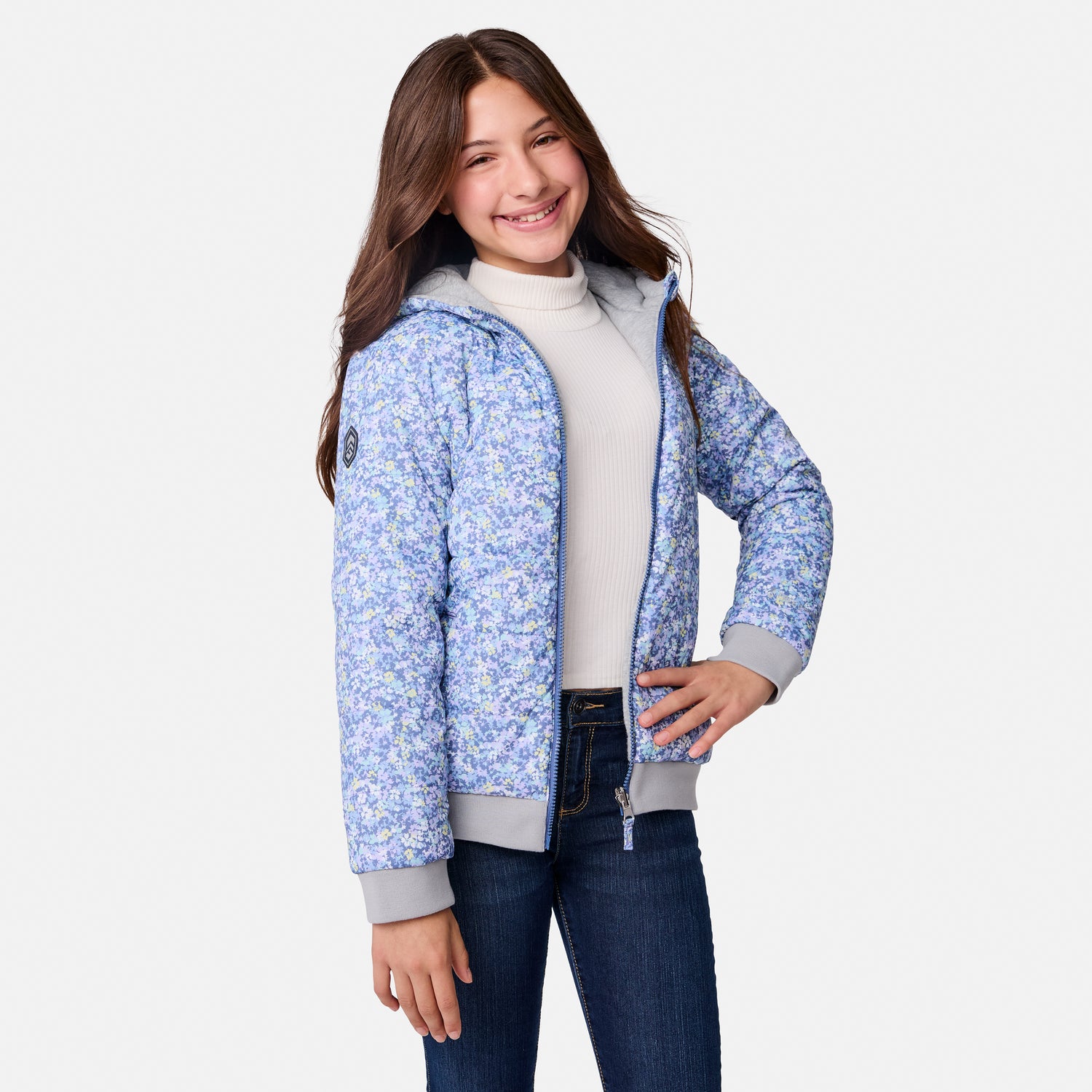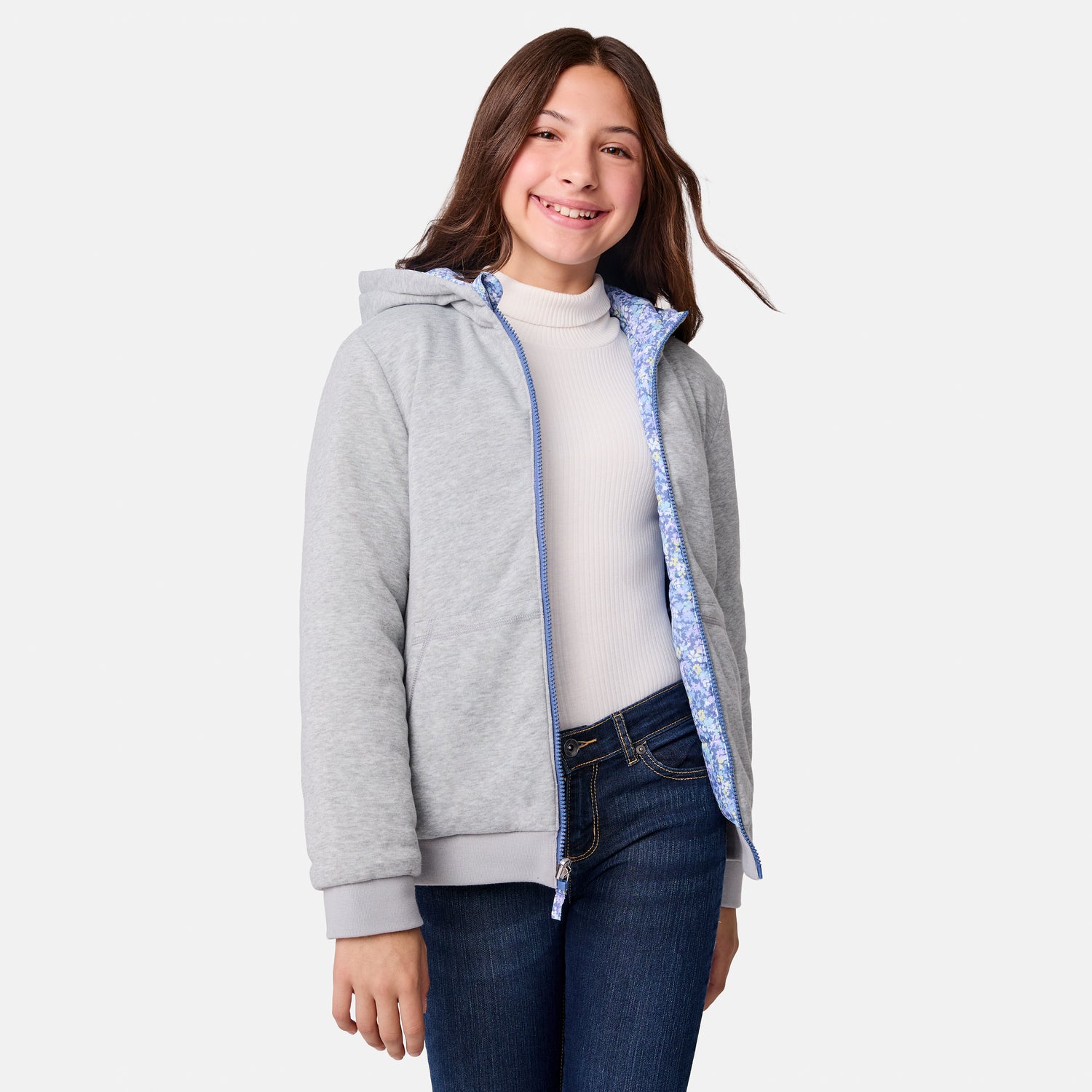 ![[Samantha is wearing size M.] Model wearing Free Country blue floral-patterned zip-front jacket with gray ribbed cuffs and hemāreverses to a solid gray hoodie for dual styling. Paired with a light gray turtleneck and dark blue jeans for a cozy-cool winter vibe.](http://freecountry.com/cdn/shop/files/87KOF5501RFC200CHAMBRAY_168_FC.jpg?v=1753903393&width=860)