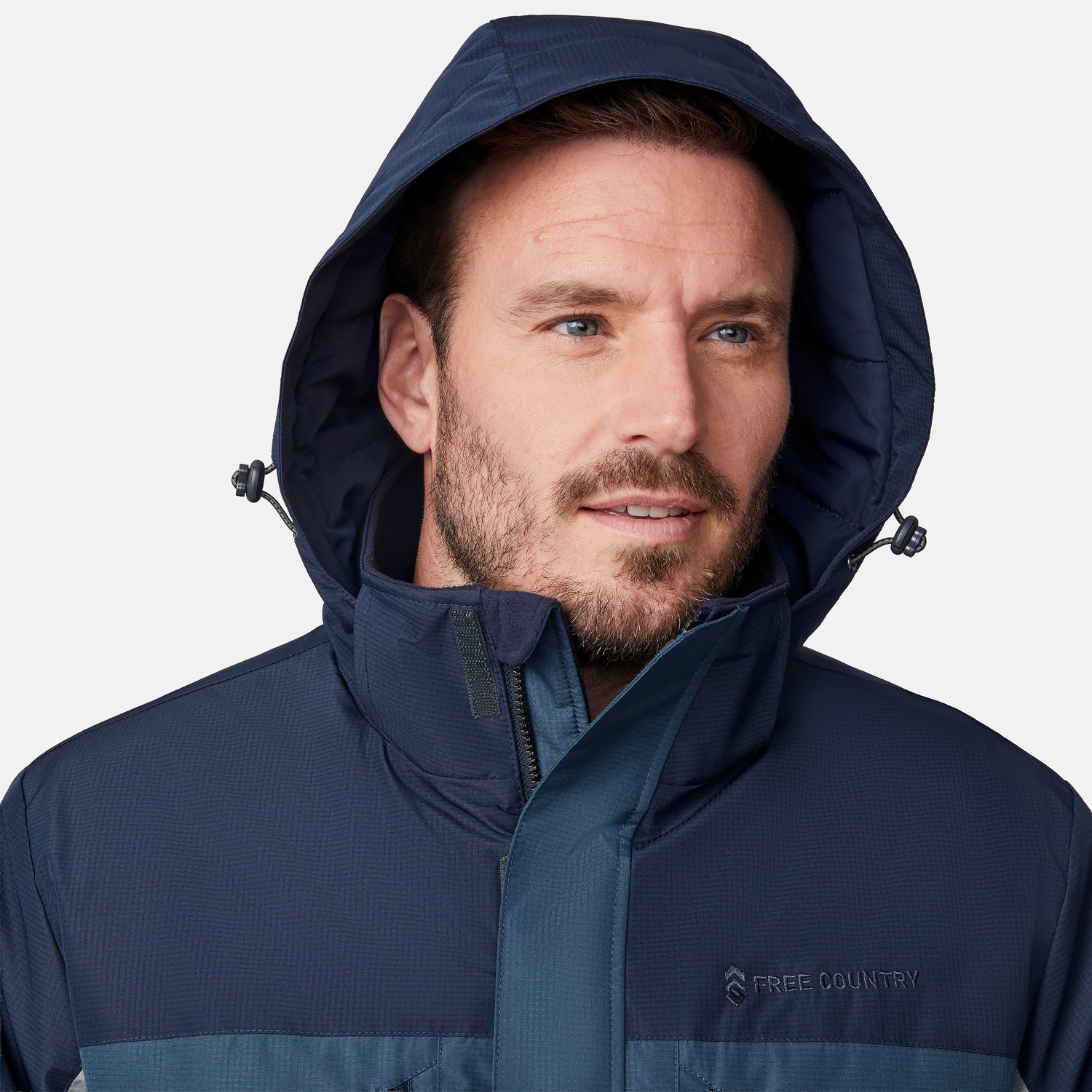 ![[Joe is 6'0" wearing size M.] Men’s Free Country hooded zip-front jacket in blue with gray paneling—featuring dual vertical zippered chest pockets and side hand pockets. Paired with light khaki pants for a clean, functional look suited to cold-weather layering and outdoor versatility.](http://freecountry.com/cdn/shop/files/90MOF5241_INDIGO_NAVY_408_FC.jpg?v=1756829165&width=860)
