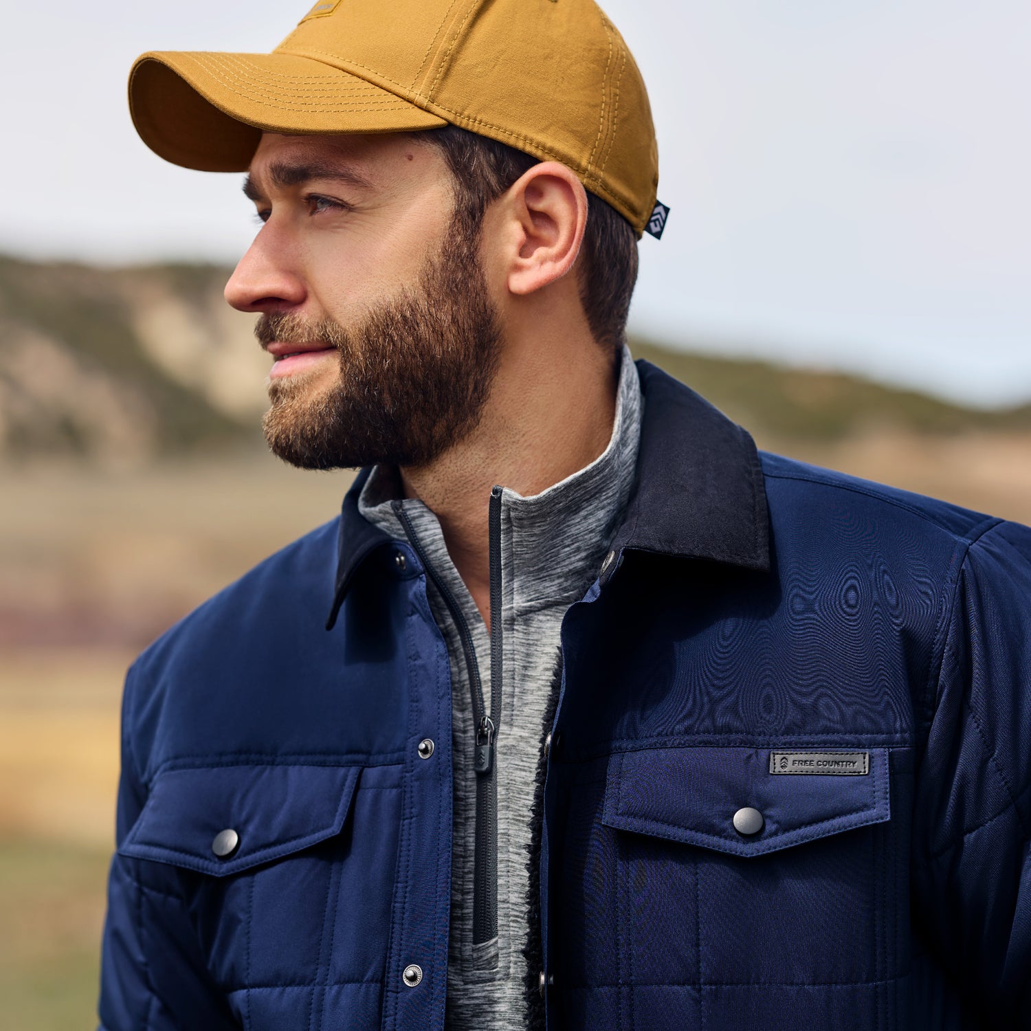 ![[Kolby is 6'2" wearing size M.] Men’s Free Country dark blue quilted jacket with button-up front, flap chest pockets, and contrasting corduroy-style collar—styled with light-colored pants for a rugged, heritage-inspired outdoor look.](http://freecountry.com/cdn/shop/files/553MOF5281_NAVY_251_fc.jpg?v=1755014268&width=860)