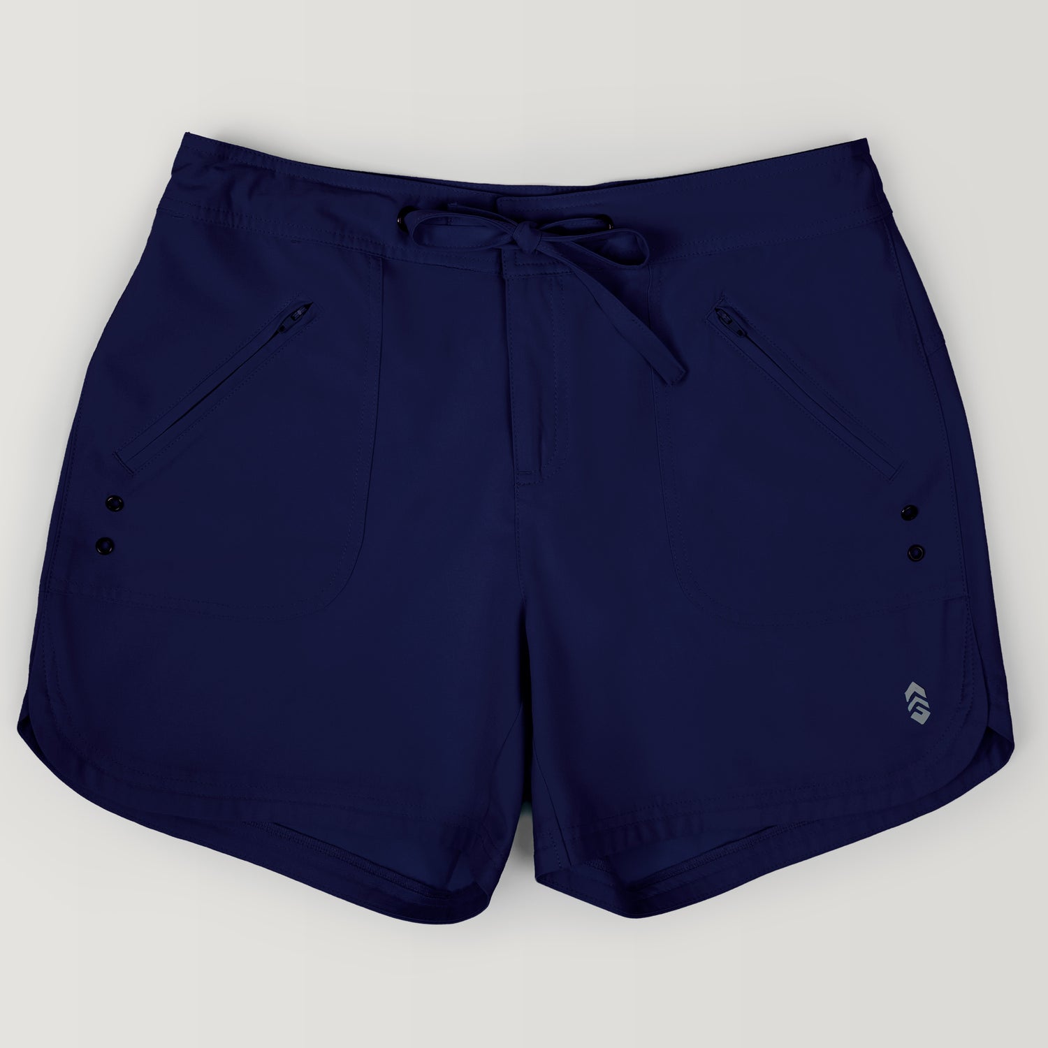 ![[Model is wearing a size Small.] Woman wearing Free Country Women's 5" Bermuda Board Short in Navy, size S, made from quick drying UPF stretch performance fabric featuring a fly front zipper closure with a drawcord and two front pockets](http://freecountry.com/cdn/shop/products/SWLSS3529NAVY_2302_SS23-007.jpg?v=1746812813&width=860)