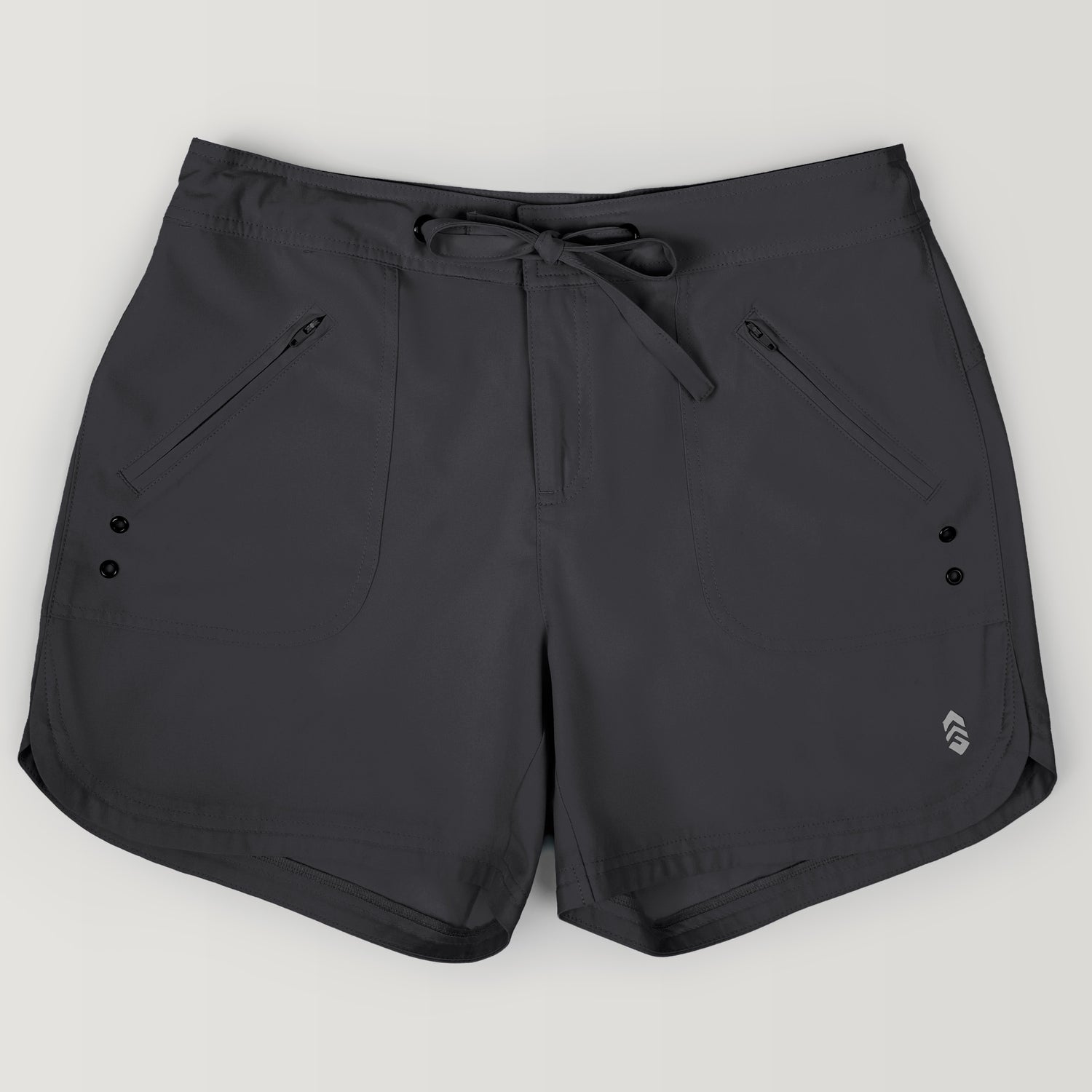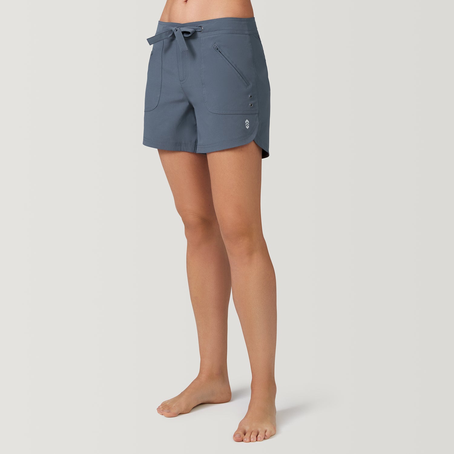 ![[Model is wearing a size Small.] Woman wearing Free Country Women's 5" Bermuda Board Short in Slate, size S, made from quick drying UPF stretch performance fabric featuring a fly front zipper closure with a drawcord and two front pockets](http://freecountry.com/cdn/shop/products/SWLSS3529SLATE_2302_SS23-021.jpg?v=1746812813&width=860)