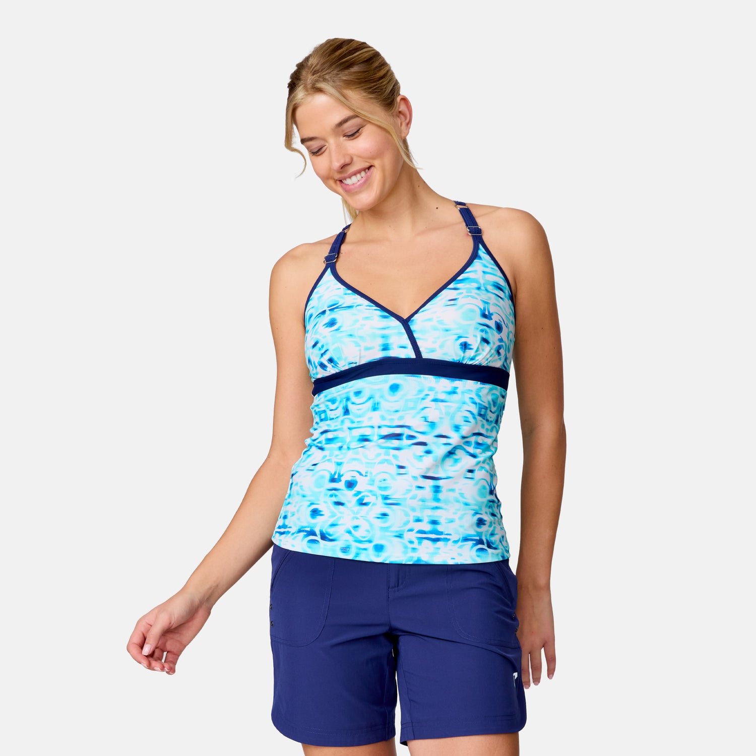 Get the coverage and support you need from a swim top without sacrificing style! This abstract mirage-print is like a work of art! Packed with performance details—like UPF 50+ protection, four-way stretch and quick-drying technology—it’s perfect for action-filled days in the sun. A shelf bra with set-in molded cups and adjustable wide straps provide the support you need for any outdoor adventure. The flattering silhouette features standout style details—like a criss-cross front design and racerback macramé braided strap—so you can feel covered and still look cool.