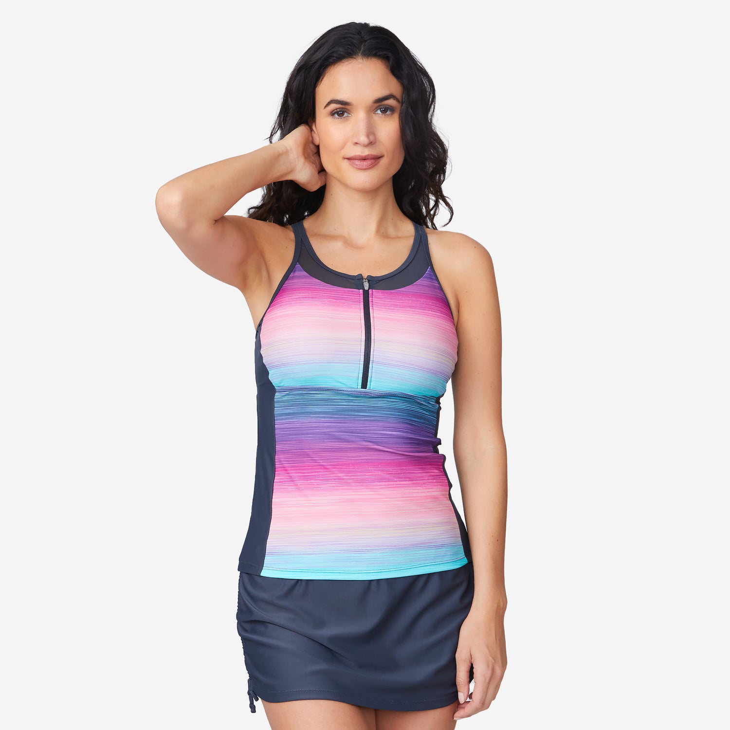 Full coverage but still fabulous! This active-inspired tankini with a fun gradient-print is designed for looking your best in and out of the water. With quick-drying, four-way stretch fabric and a supportive built-in molded shelf bra, you can wear it swimming or during sweat-sessions at the gym.