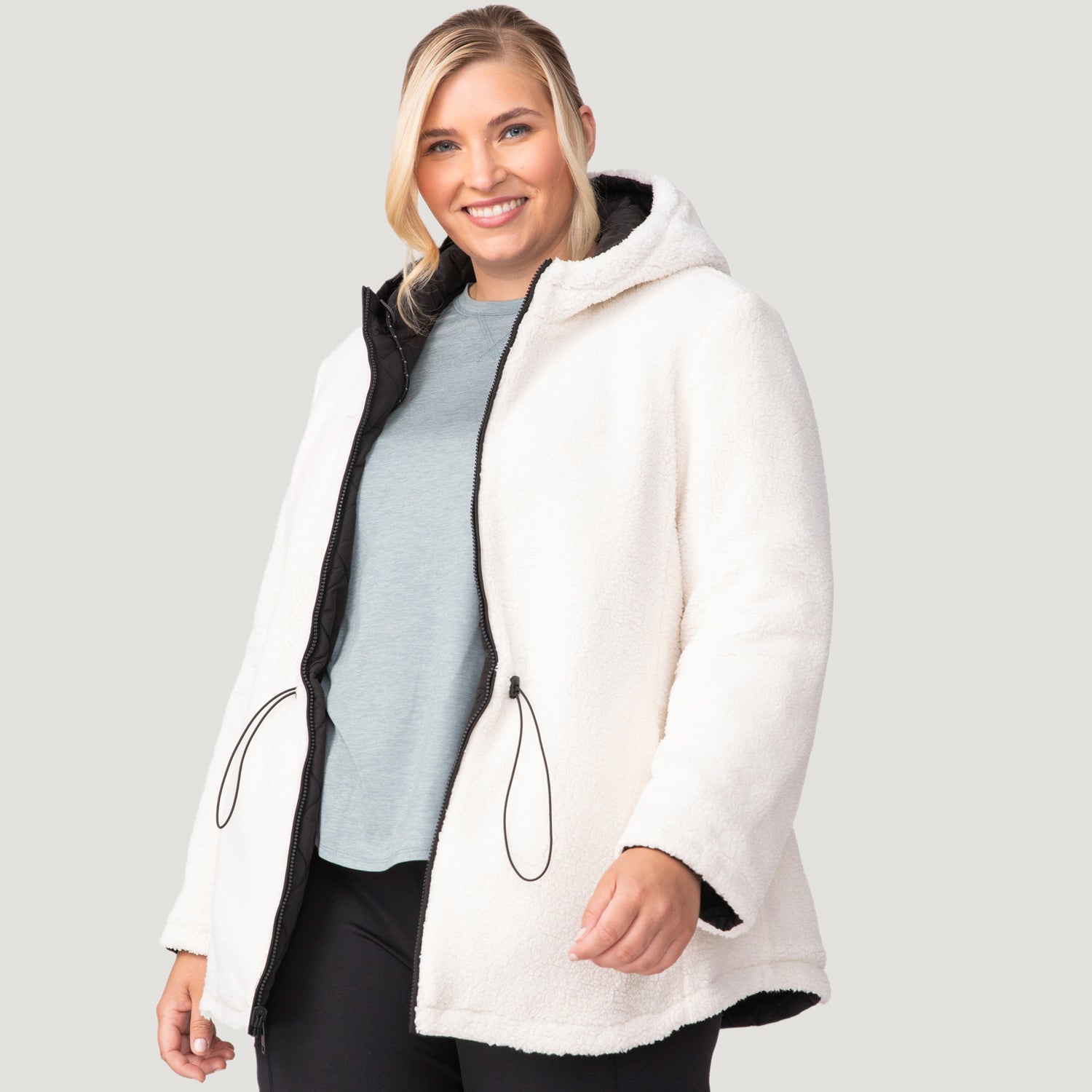 ![[Lola is 5'10.5" wearing a size 1X.] Woman wearing Free Country Women's Plus Size Switch It Up Cloud Lite Reversible Jacket in black with a full front zipper opening, attached hood with adjustable drawcord, diamond quilting, soft lining, and water resistant and wind resistant stretch performance fabric. light grey background. Perfect women’s jacket for fall weather.](http://freecountry.com/cdn/shop/files/513LOF4549RXBLACK_2408_FW24-008.jpg?v=1756926588&width=860)