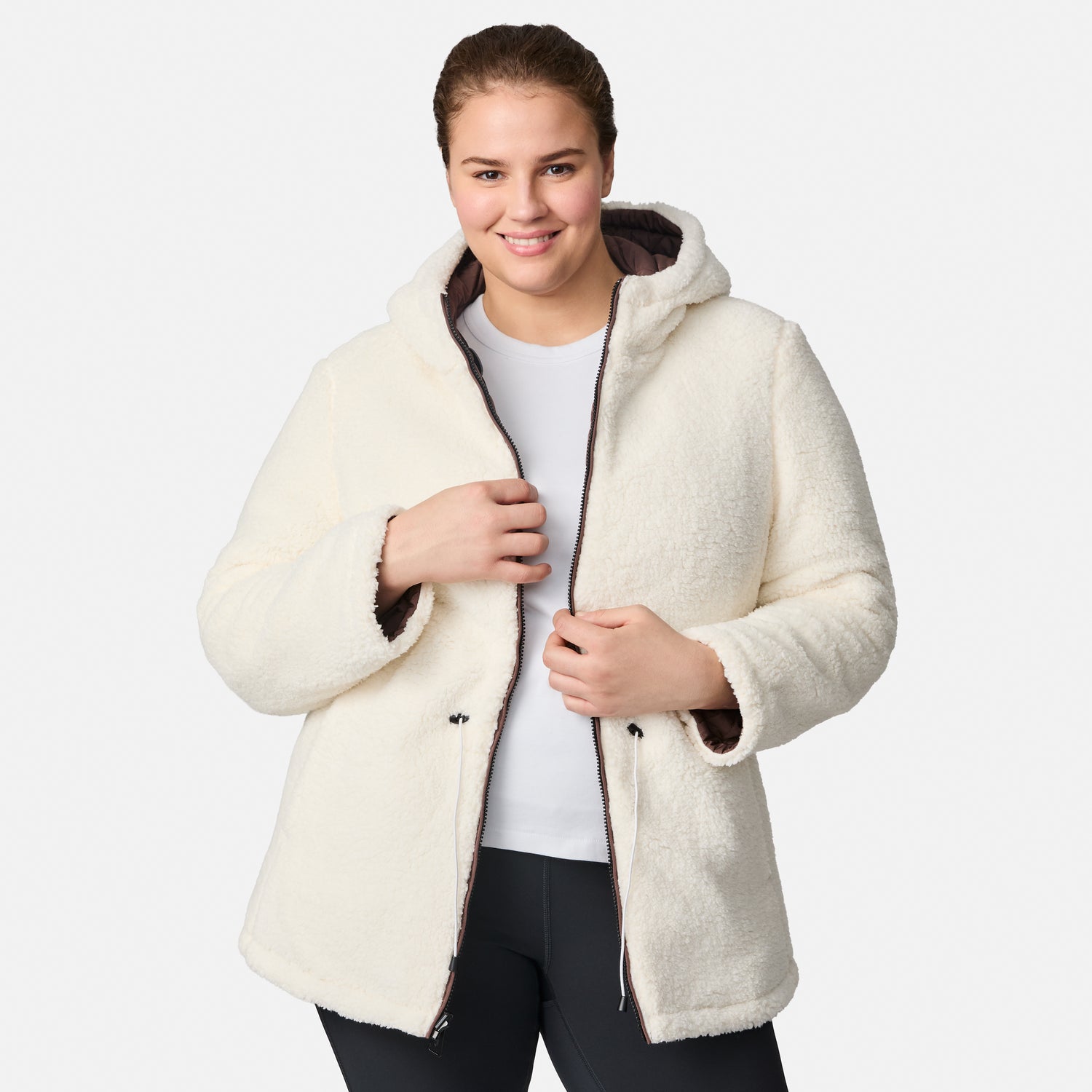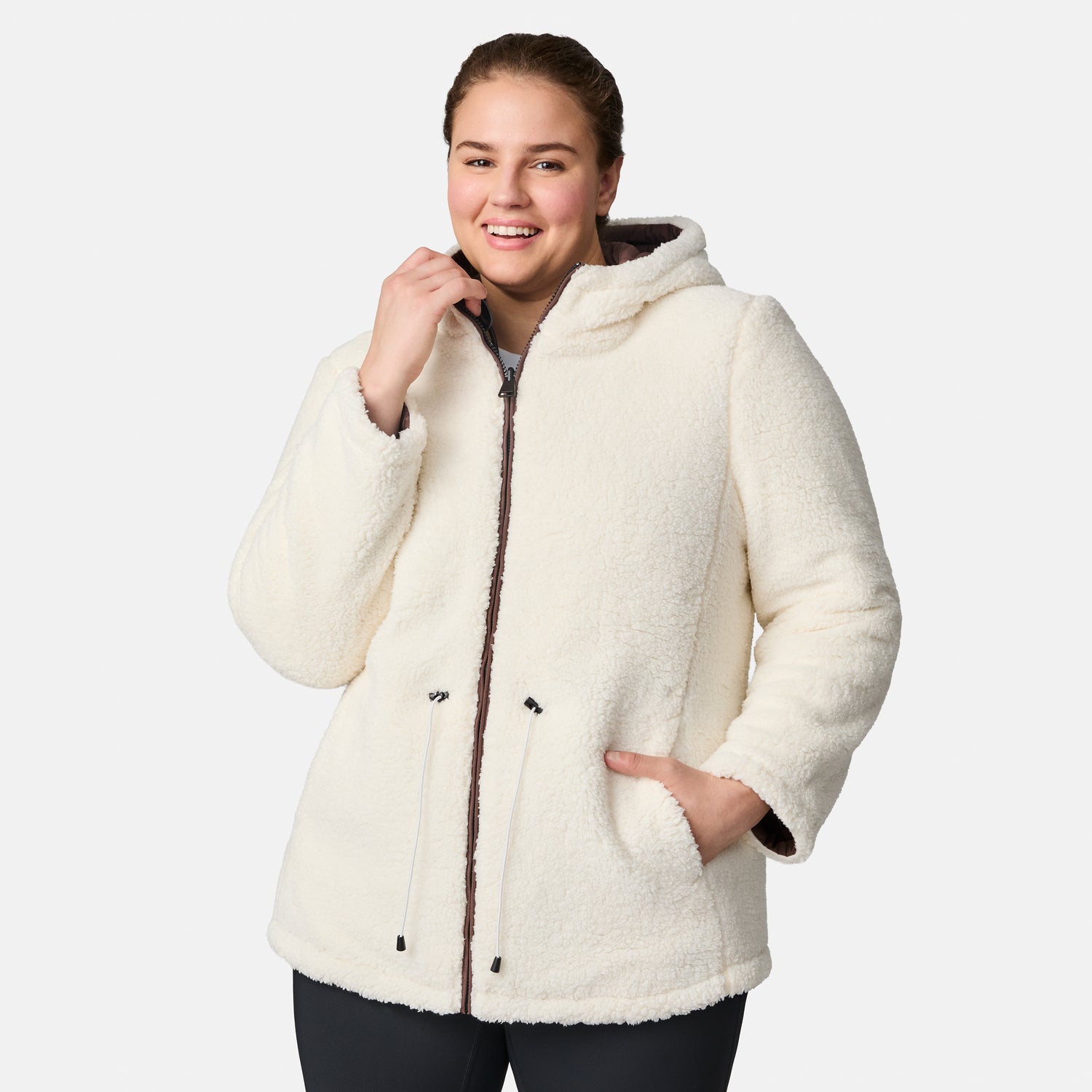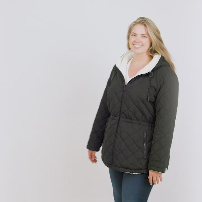 ![[Karissa is 5’9.5” wearing size 1X.] Women’s quilted brown hooded jacket with diamond pattern, zippered pockets, and drawstring waist — warm, fleece-lined outerwear for cold weather](http://freecountry.com/cdn/shop/files/513LOF5549RX_HICKORY_293_FC.jpg?v=1756926588&width=860)