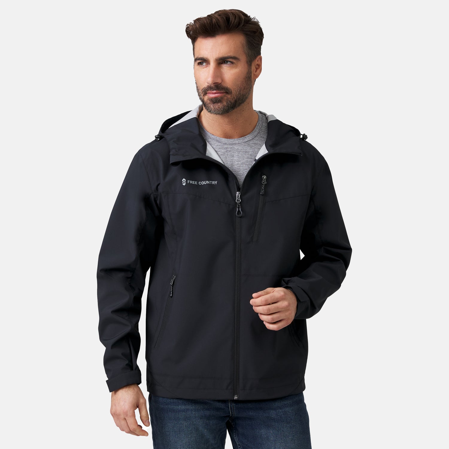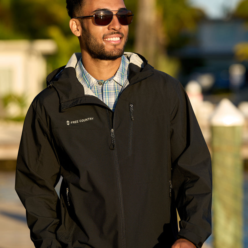 ![[Justin is 6’1” wearing a size Medium.] Man wearing Free Country Men's Hydro Lite X2O Status Jacket in Black, size M, made from lightweight four way stretch water-resistant performance fabric featuring tab cuffs, an attached hood with a drawcord, and a chest and lower pockets, styled with black pants #color_black](http://freecountry.com/cdn/shop/files/212MOS4003JETBLACK_2312_SS24-015.jpg?v=1751316295&width=860)