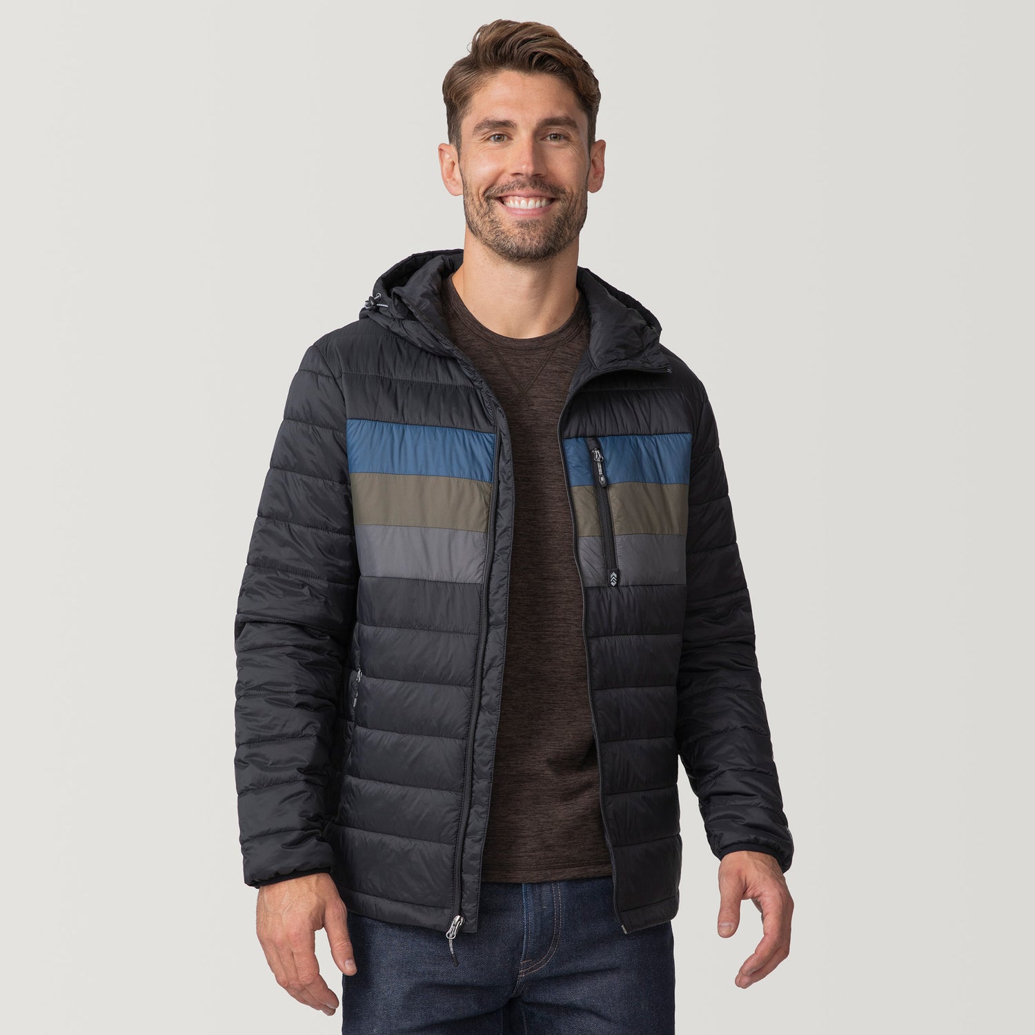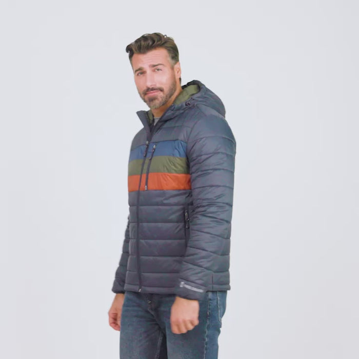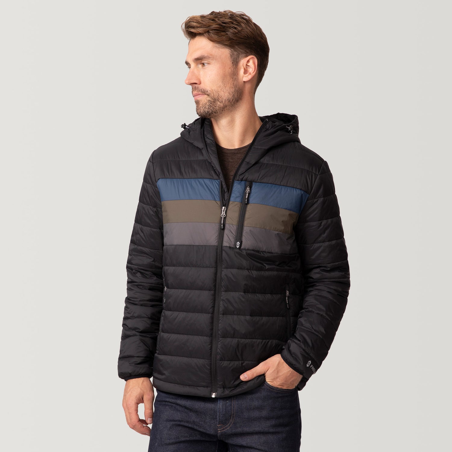 ![[Matt is 6'2" wearing a size Medium.] Man wearing the Free Country Men's Tri-Color Hooded Puffer Jacket in black with horizontal stripes in blue, brown, and grey, standing against a plain light background.](http://freecountry.com/cdn/shop/files/75-MOF4263JETBLK_2407_FW24-041.jpg?v=1753213477&width=860)