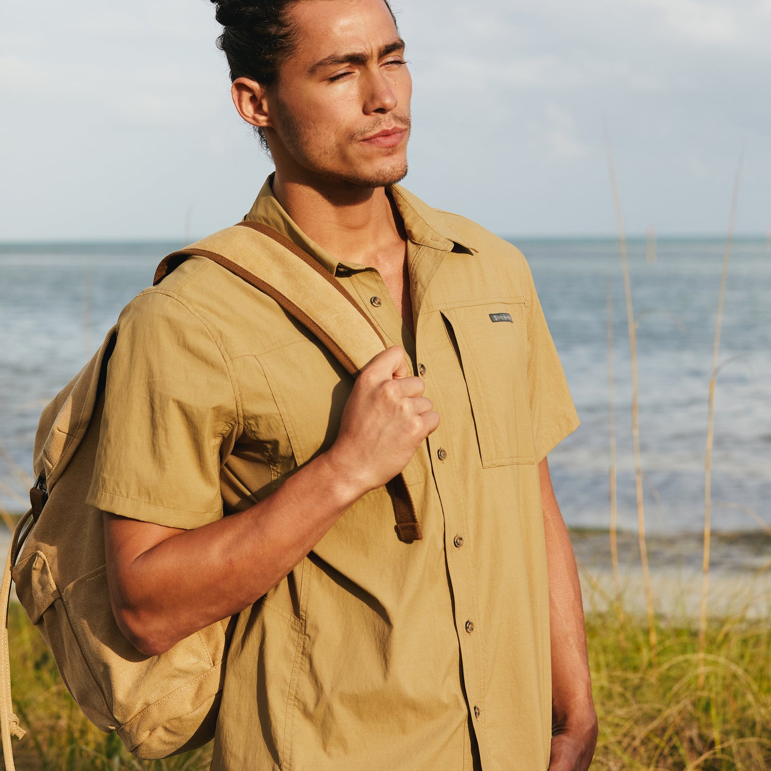 ![[Justin is 6'1" wearing a size Medium.] Man wearing the Free Country Men's Acadia Short Sleeve Shirt in Wheat, size M, featuring a short sleeves, mesh underarm panels for breathability, and a zipper chest pocket made from lightweight polyester fabric, styled with khaki shorts #color_ wheat](http://freecountry.com/cdn/shop/files/482MAS4206WHEAT_2312_SS24-032.jpg?v=1751306901&width=860)