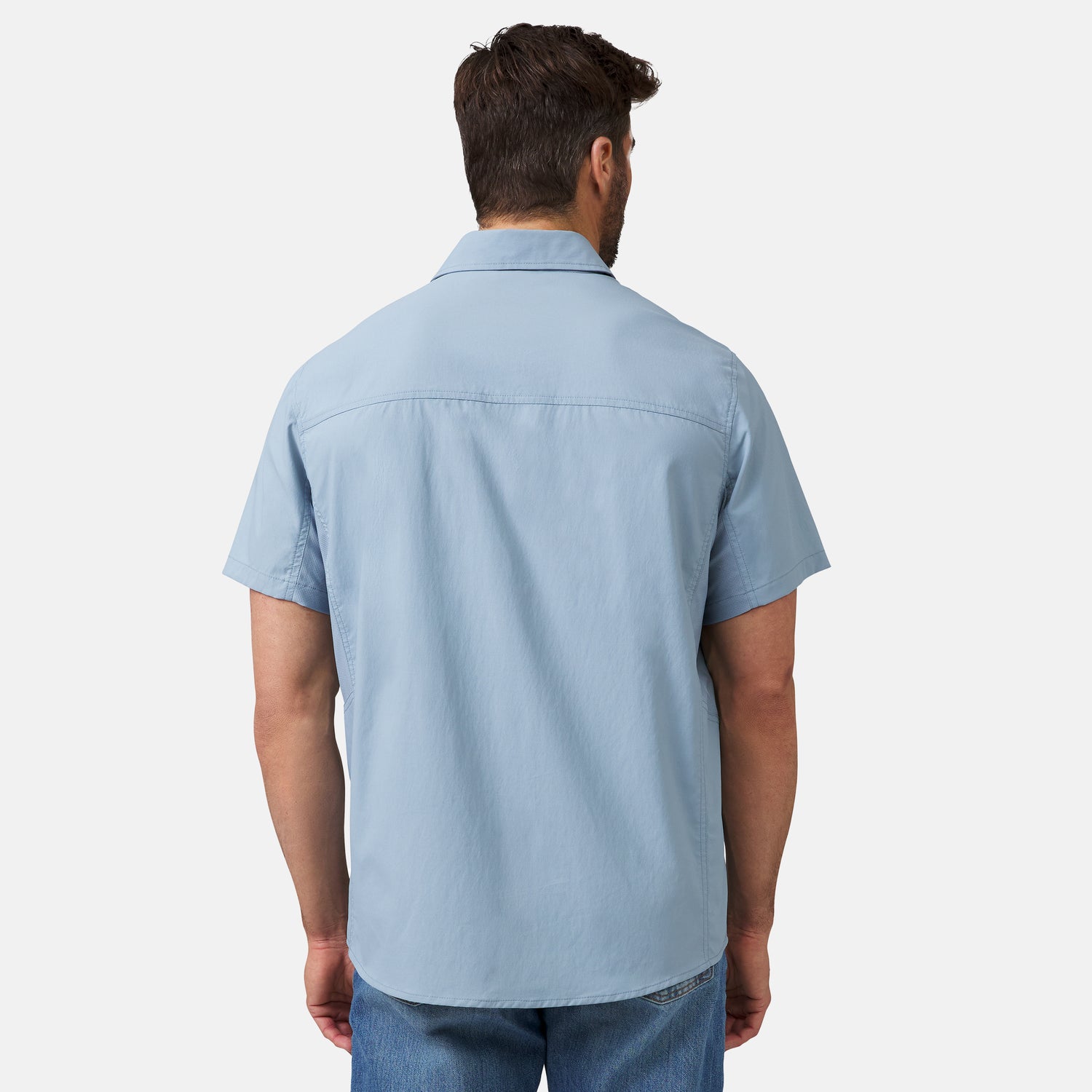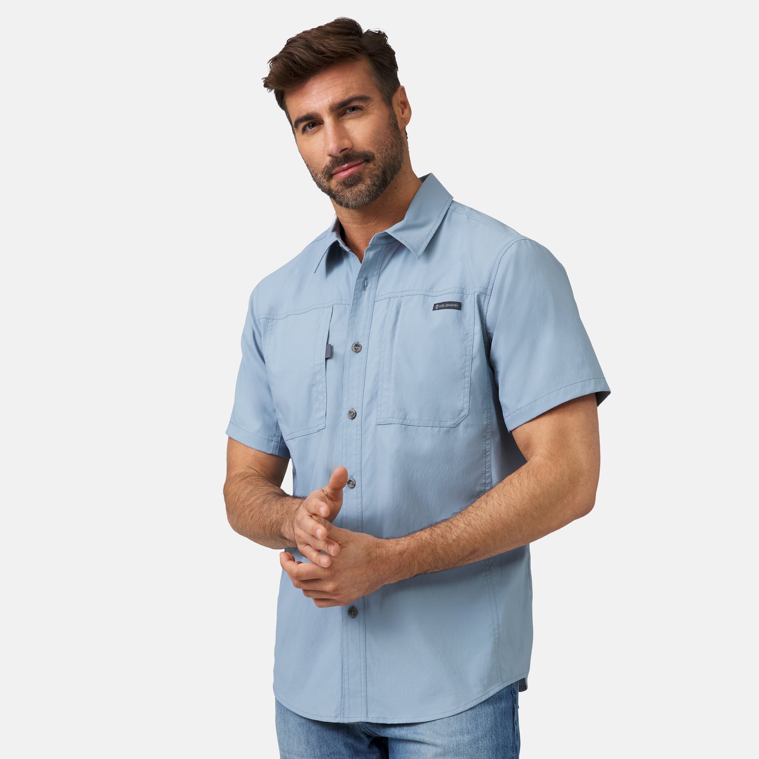 ![[Justin is 6'1" wearing a size Medium.] Man wearing the Free Country Men's Acadia Short Sleeve Shirt in BLUESTONE, size M, featuring a short sleeves, mesh underarm panels for breathability, and a zipper chest pocket made from lightweight polyester fabric, styled with khaki shorts #color_ bluestone](http://freecountry.com/cdn/shop/files/482MAS5206BLUESTONE_2412_SS25-019-FC.jpg?v=1750697277&width=860)