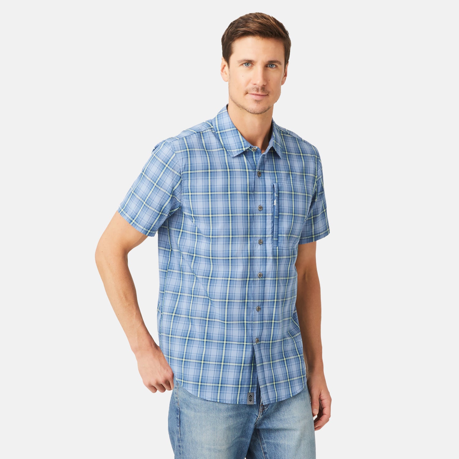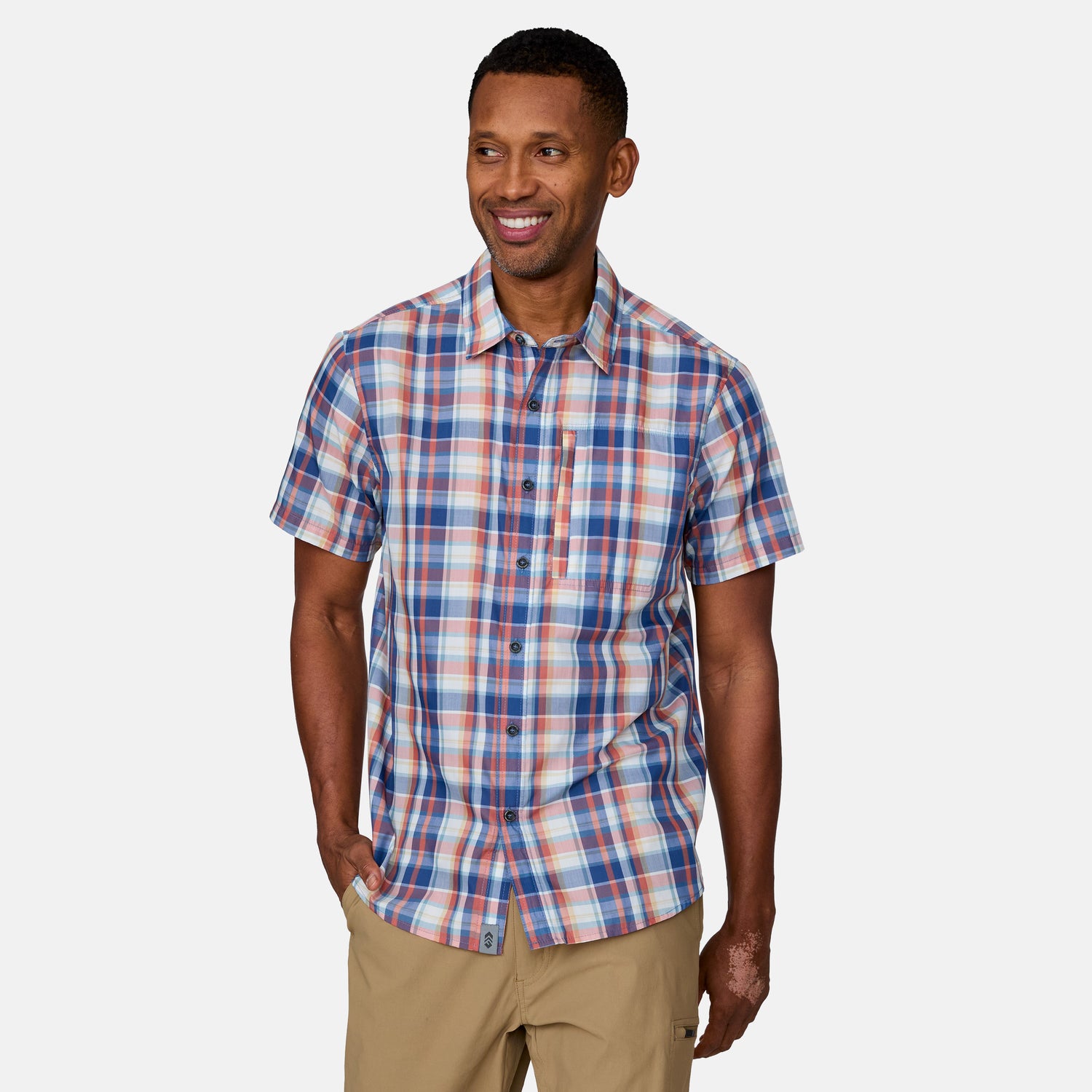 ![[Josiah is 6'3" wearing a size Medium.] Man wearing the Free Country Men's Excursion Short Sleeve Poplin Shirt in Denim Plaid, size M, made from lightweight moisture wicking polyester fabric featuring vent at the back, full button down front, and a stand collar, styled with navy shorts #color_ denim-plaid](http://freecountry.com/cdn/shop/files/446-MAS5200_Denim-Plaid_SS25-FC-PDP-1.jpg?v=1750884034&width=860)