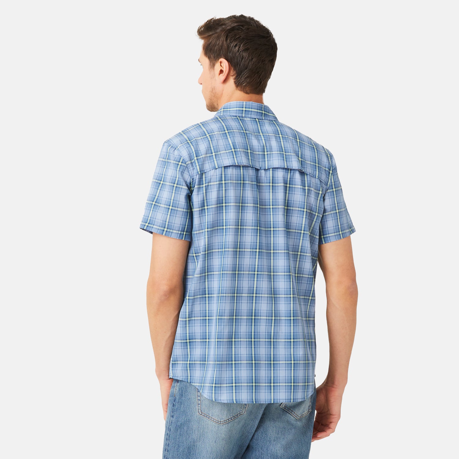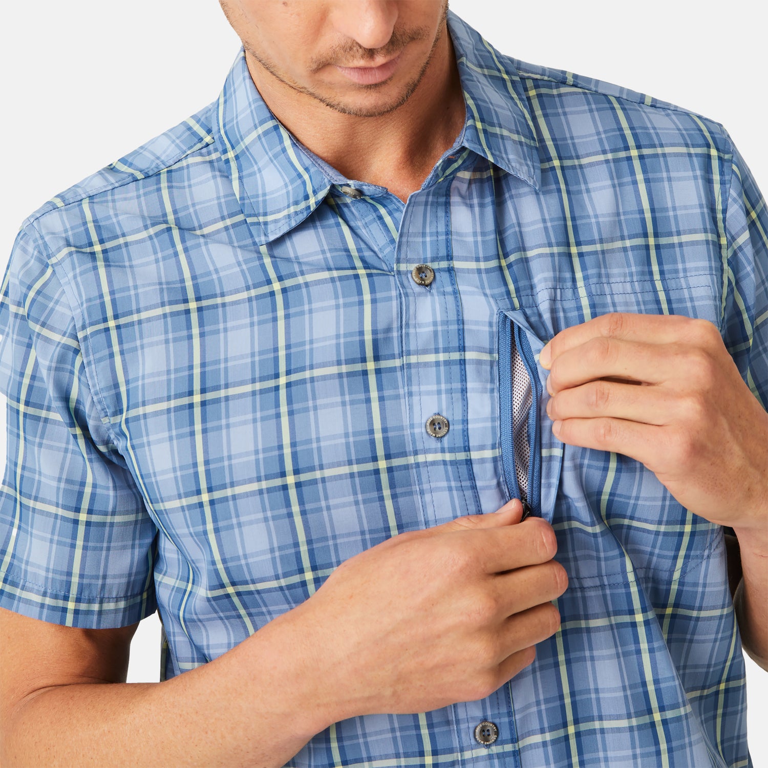 ![[Will is 6'2" wearing a size Medium.] Man is wearing Free Country Men's Excursion Short Sleeve Poplin Shirt in Denim Trails Plaid, size M, made from lightweight moisture wicking polyester fabric featuring vent at the back, full button down front, and a stand collar, styled with brown shorts #color_denim-trails](http://freecountry.com/cdn/shop/products/446MAS32001423DENIMTRAILS_2212_FW-040.jpg?v=1751306474&width=860)