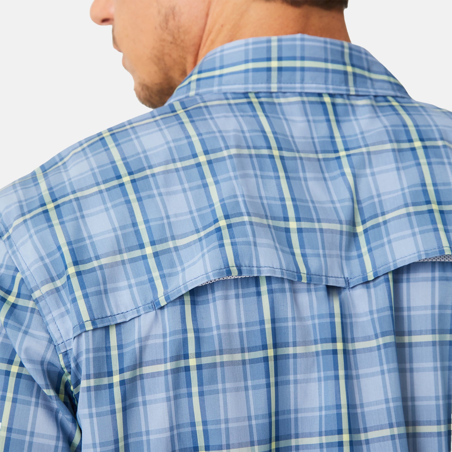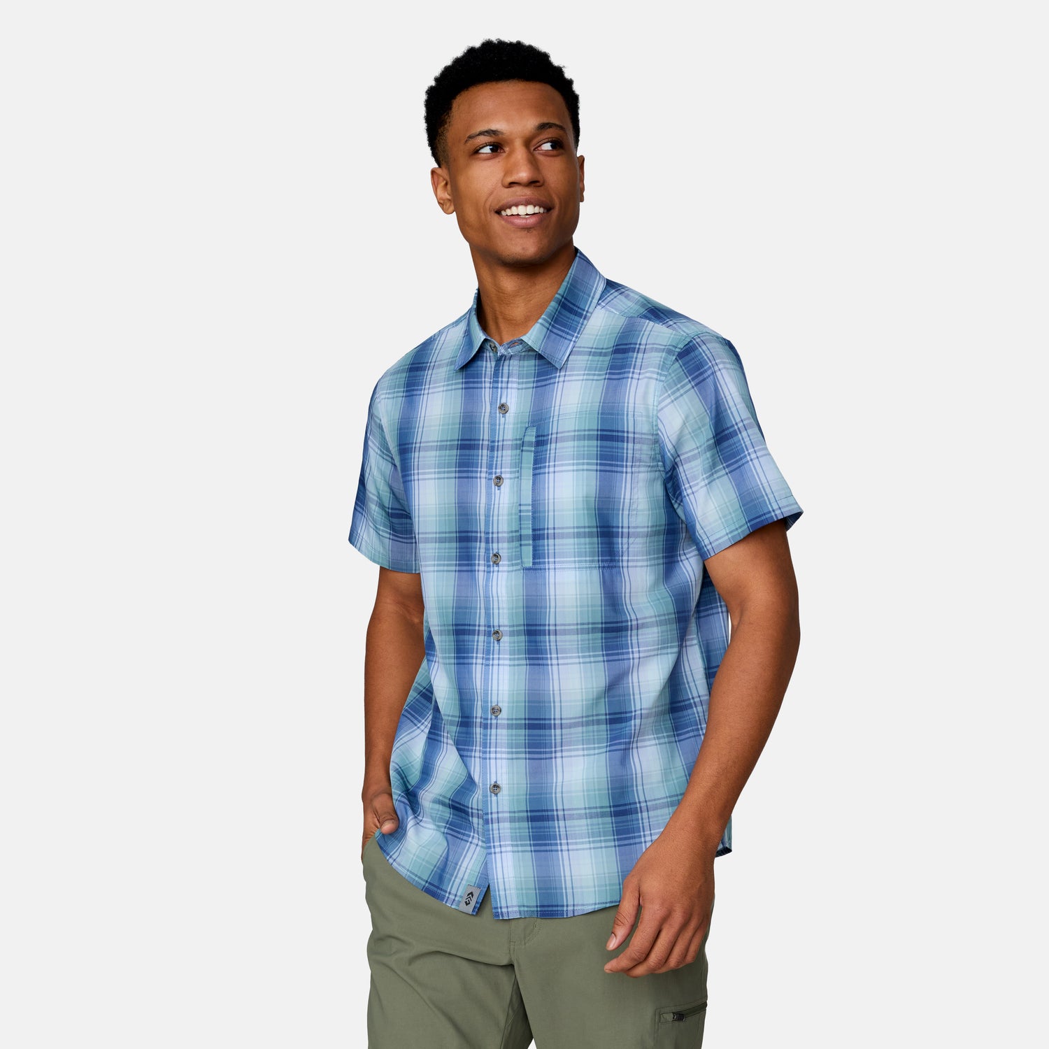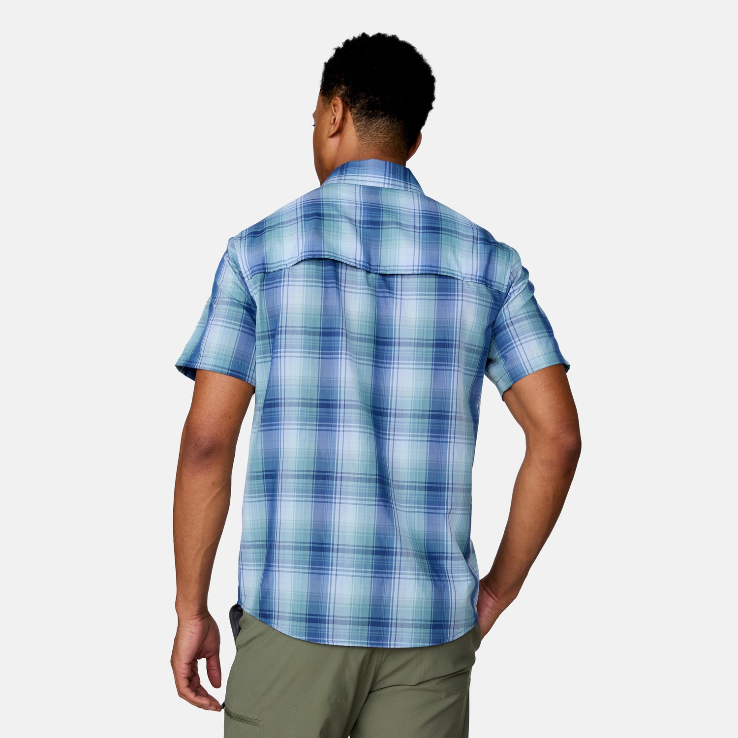 ![[Miguel is 6'2" wearing a size Medium.] in Blue Shadow Plaid, size M, made from lightweight moisture wicking polyester fabric featuring vent at the back, full button down front, and a stand collar, styled with khaki shorts #color_blue-shadow-plaid](http://freecountry.com/cdn/shop/files/446-MAS5200_Blue-Shadow-Plaid_SS25-FC-PDP_1.jpg?v=1751382397&width=860)
