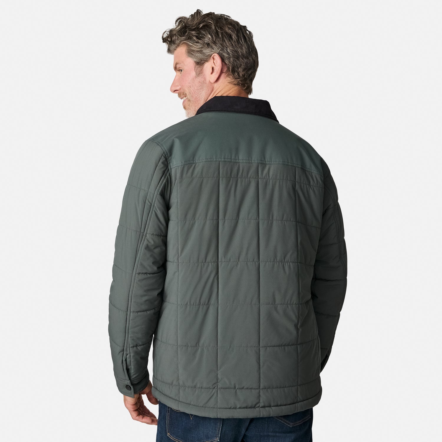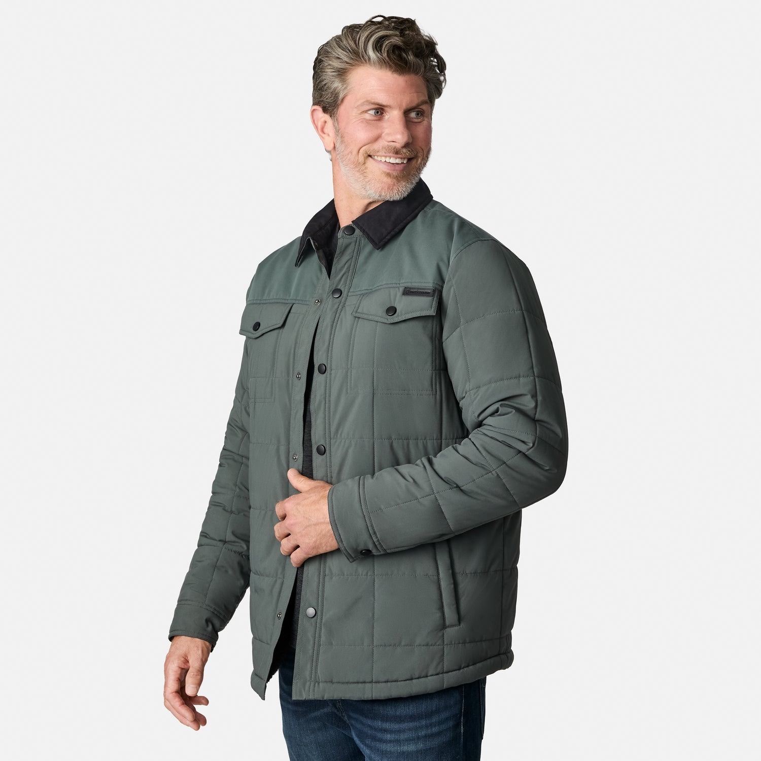 ![[Kolby is 6'2" wearing size M.] Men’s Free Country green quilted jacket with black corduroy-style collar and button-up front—featuring dual flap chest pockets, angled side hand pockets, and a rugged outdoor look. Paired with dark pants for versatile, cold-weather styling.](http://freecountry.com/cdn/shop/files/553MOF5281_EVERGREEN_142_FC.jpg?v=1755805369&width=860)
