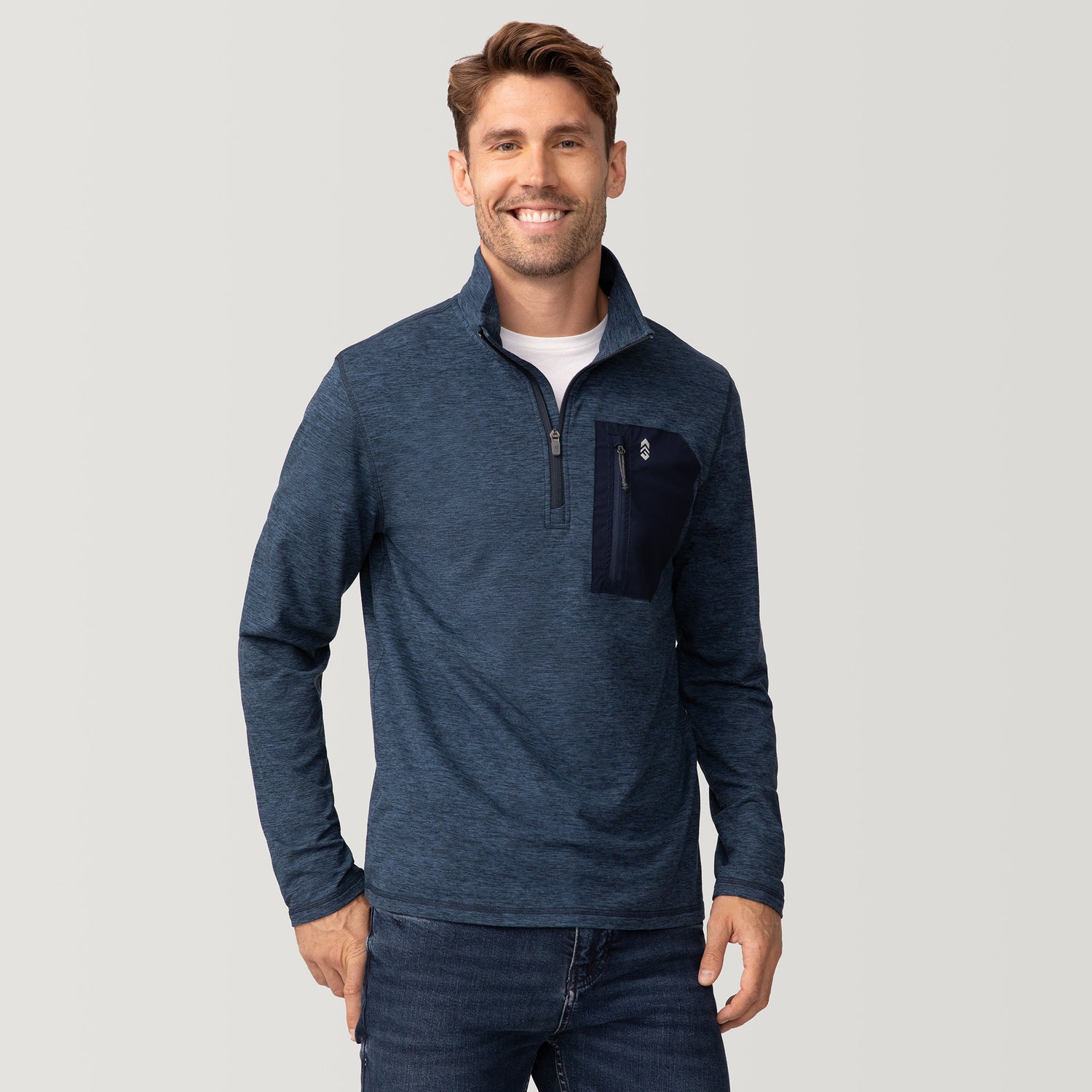 ![[Kolby is 6'2" wearing size M.] Men’s Free Country gray quarter-zip pullover with zippered chest pocket in contrasting fabric—paired with brown pants. Designed for lightweight layering, combining casual comfort and outdoor-ready functionality.](http://freecountry.com/cdn/shop/files/11MMAF5556_GREY_SPACEDYE_2506_SS25-016_FC.jpg?v=1755800351&width=860)