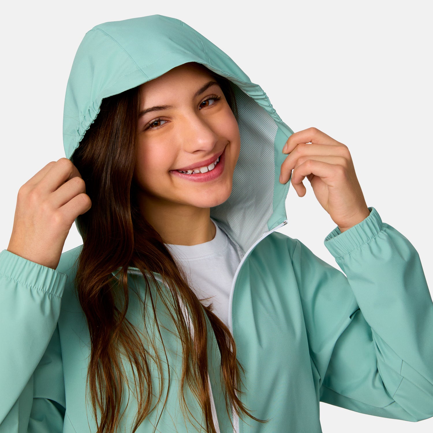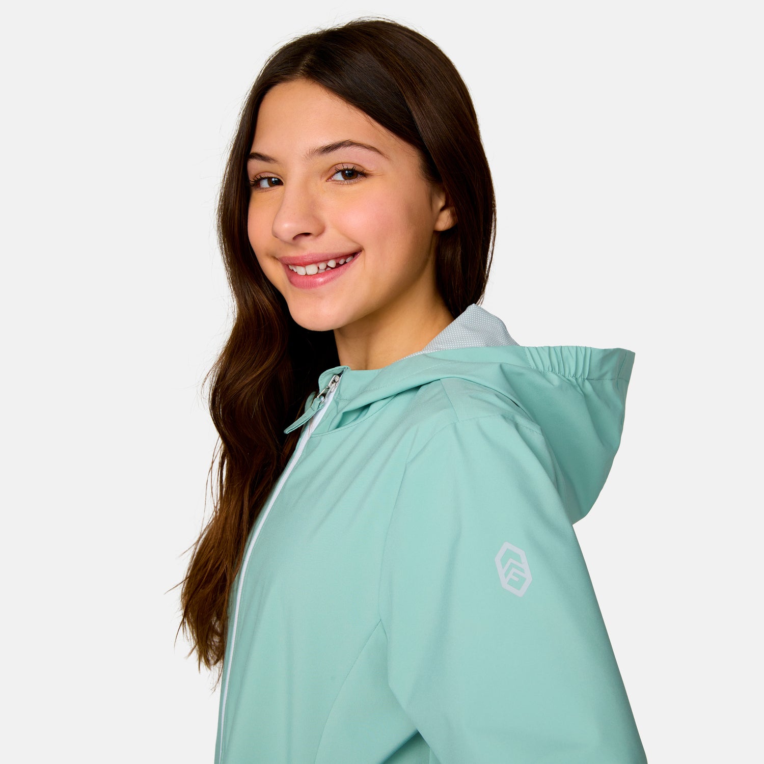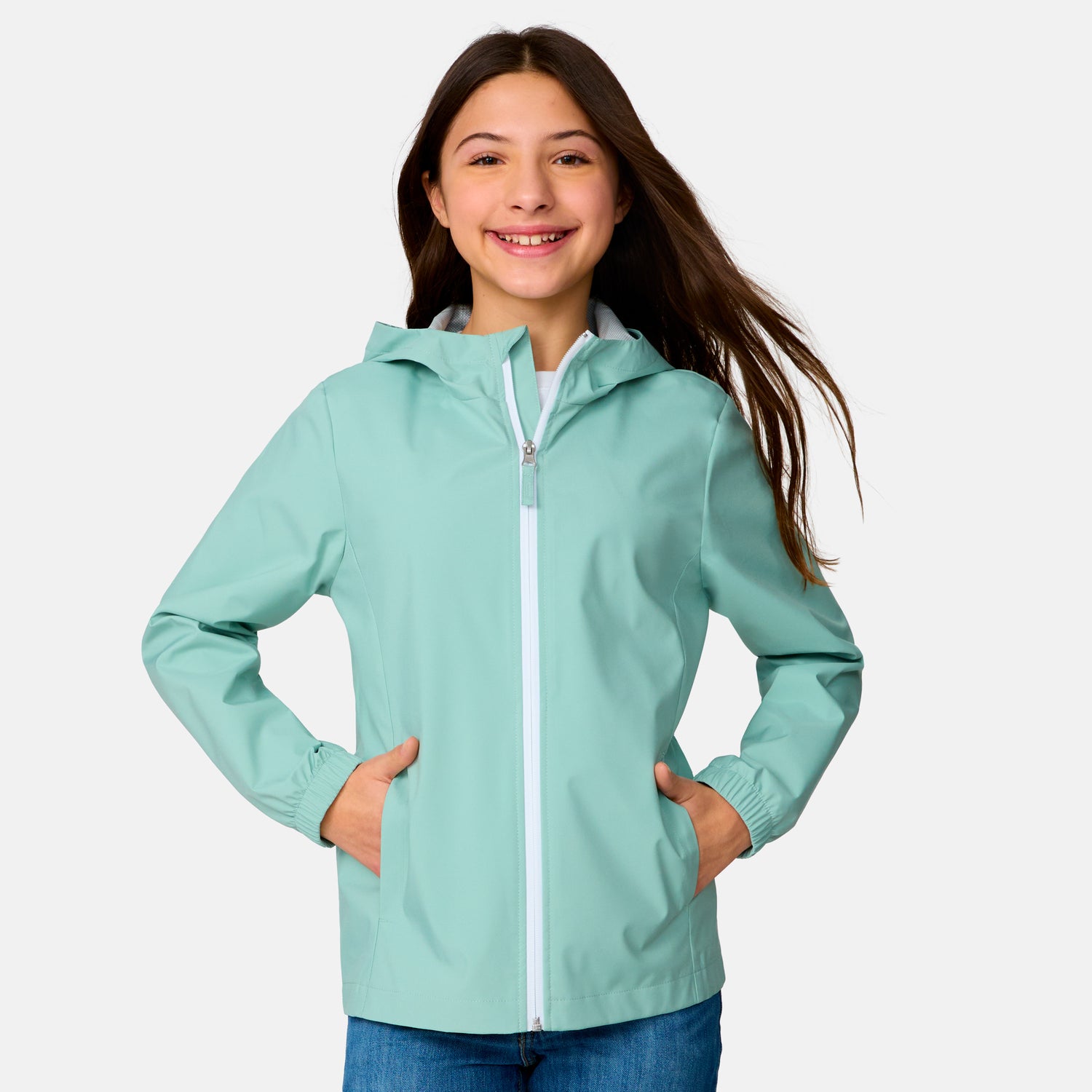 ![[Model is wearing a size Medium.] Girl wearing the Free Country Girls' Recess X2O Rain Jacket in Green Tea, size M, featuring lightweight stretch weatherproof fabric and a full length zipper and attached hood, paired with blue jeans #color_ green-tea](http://freecountry.com/cdn/shop/files/212KOS5006_Green-Tea_SS25-FC-PDP_2.jpg?v=1750783622&width=860)
