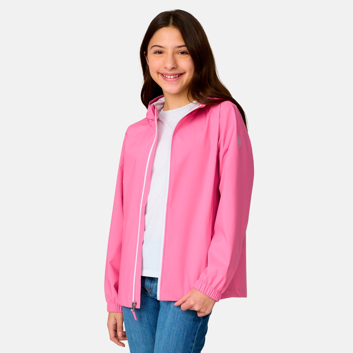 ![[Model is wearing a size Medium.] Girl wearing the Free Country Girls' Recess X2O Rain Jacket in Rosie, size M, featuring lightweight stretch weatherproof fabric and a full length zipper and attached hood, paired with blue jeans #color_ rosie](http://freecountry.com/cdn/shop/files/212KOS5006_Rosie_SS25-FC-PDP_2.jpg?v=1750783879&width=860)