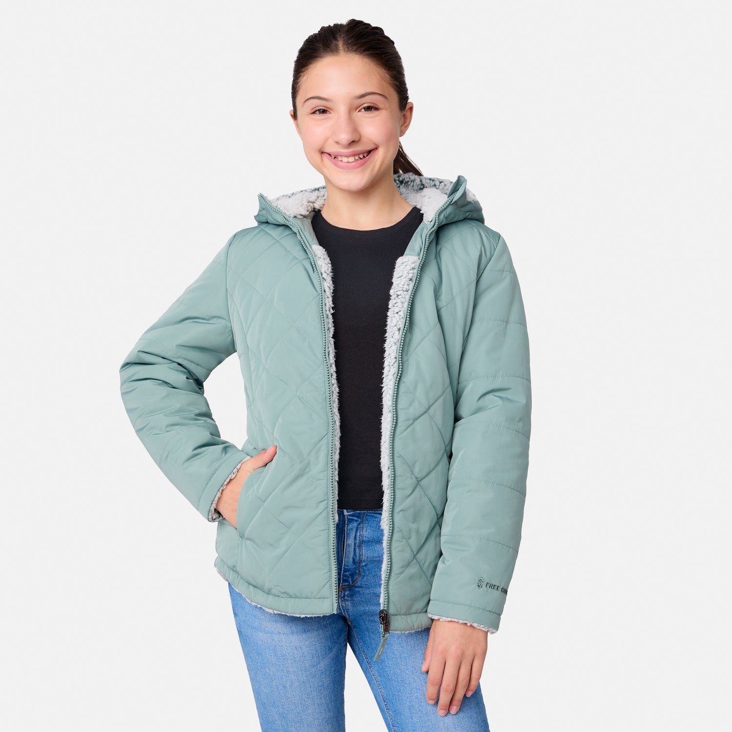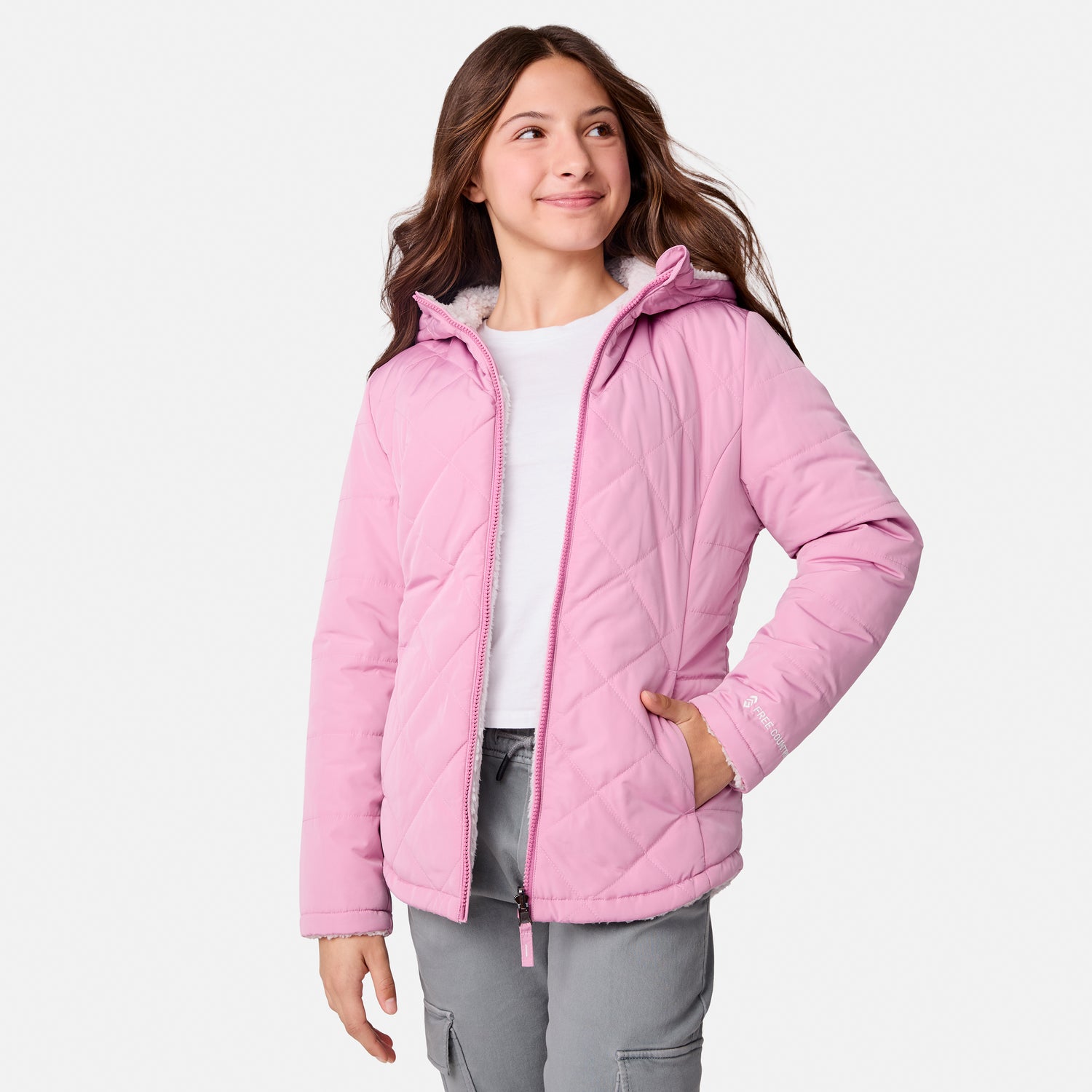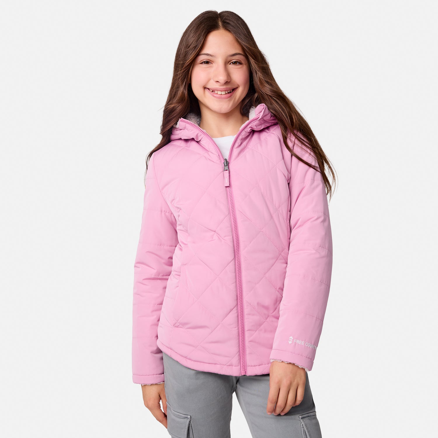 ![[Model is wearing a size Medium.] Girl wearing the Free Country Girls' Stratus Lite Reversible Jacket in grey, featuring a diamond quilted pattern and a sherpa lining, standing and smiling with hands in pockets against a plain backdrop.](http://freecountry.com/cdn/shop/files/513GOF4206RVINE_2408_FW24-046.jpg?v=1753211676&width=860)