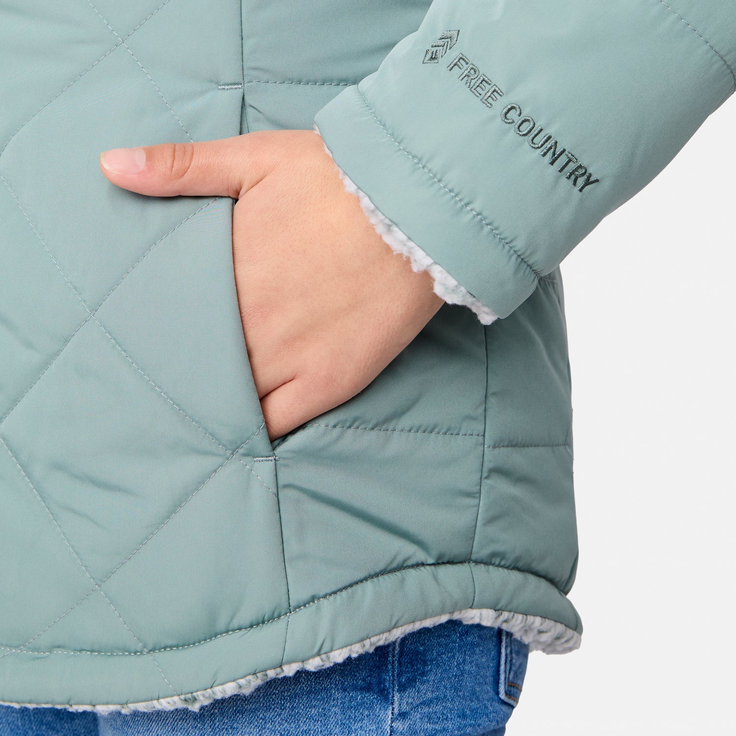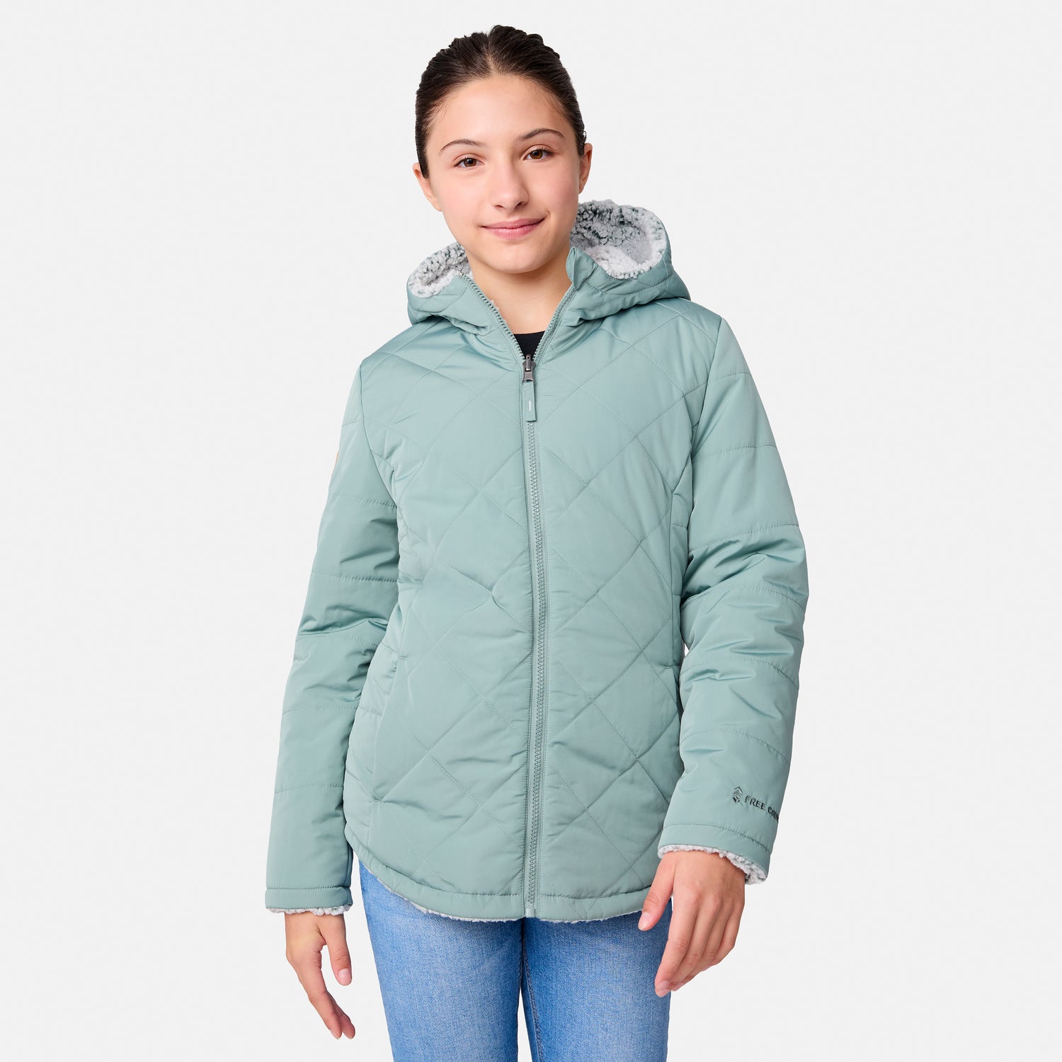 ![[Model is wearing a size Medium.] Girl wearing the Free Country Girls' Stratus Lite Reversible Jacket in grey, featuring a diamond quilted pattern and a sherpa lining with a plain yolk, standing and smiling with hands in pockets against a plain backdrop.](http://freecountry.com/cdn/shop/files/513GOF4206RVINE_2408_FW24-094.jpg?v=1753211676&width=860)