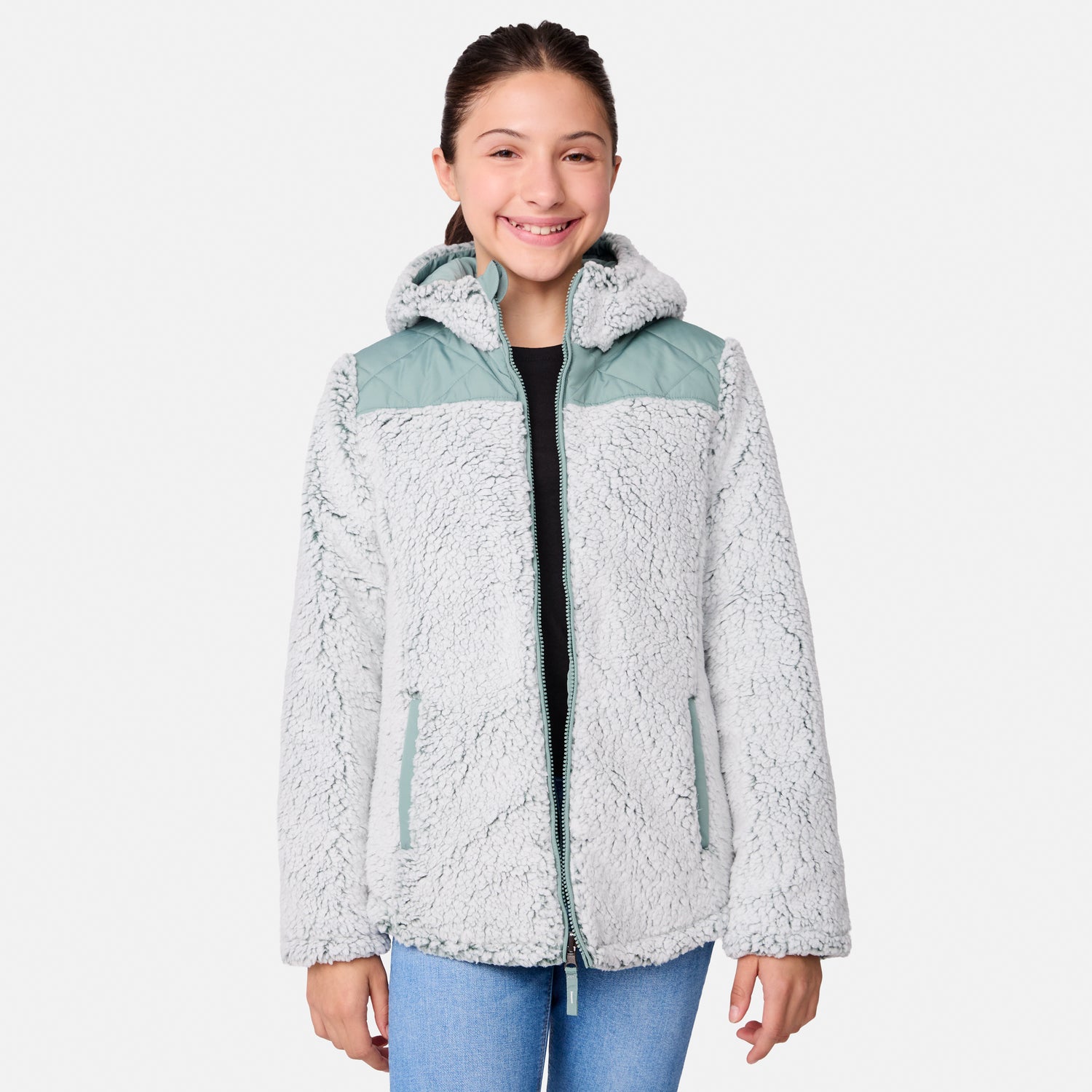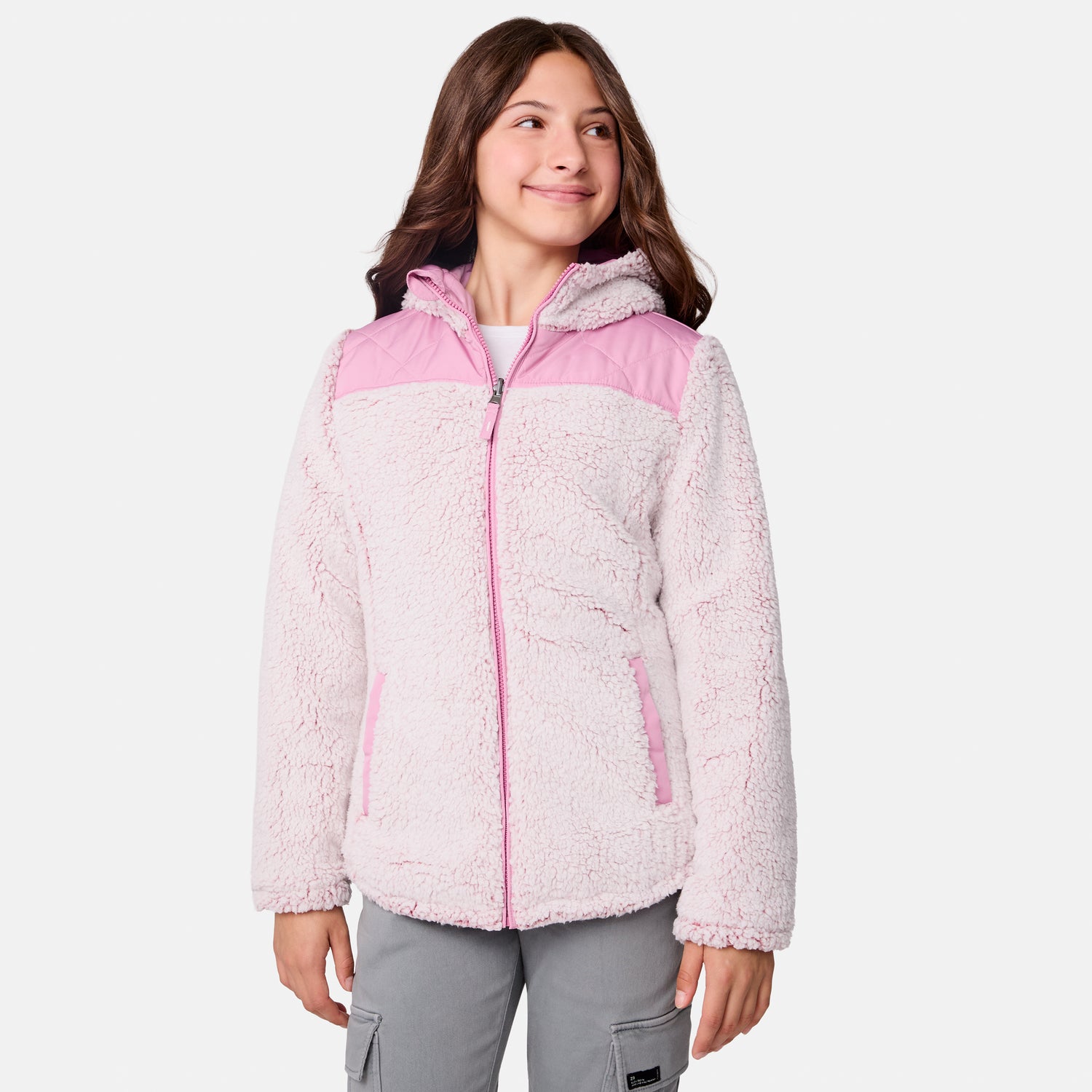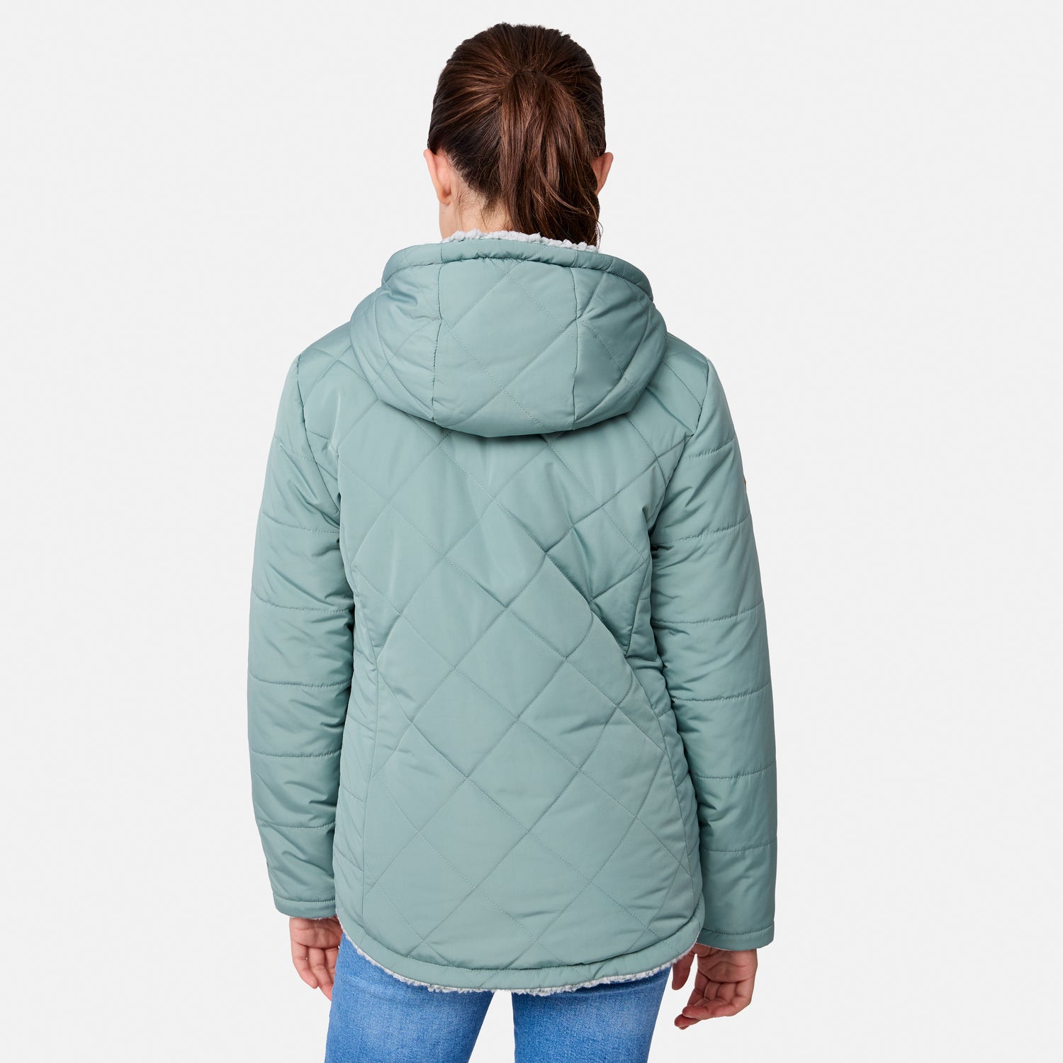 Perfect for the girl who loves options, this reversible jacket is a wardrobe win. One side features a sleek diamond-quilted pattern for a classic vibe, while the other wraps her in soft sherpa for ultimate snuggle-worthy warmth. The full zip front makes it easy to switch up her look, and the attached hood is ready for whatever the weather brings. Plus, it’s machine washable, so she can wear it on repeat without a worry. Versatile, stylish and oh-so-cozy—this two-in-one eco-friendly wonder effortlessly matches every mood and outdoor setting with ease.