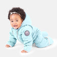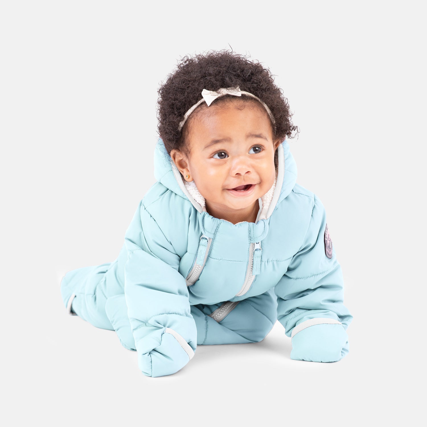 The double zipper opening makes it easy to pop on and off, with a chin guard for added protection. An attached hood keeps tiny heads toasty, while matte stretch binding ensures they stay comfy and snug all day long. Whether it's their first snow day or a chilly morning stroll, this snow suit is the ultimate winter essential!