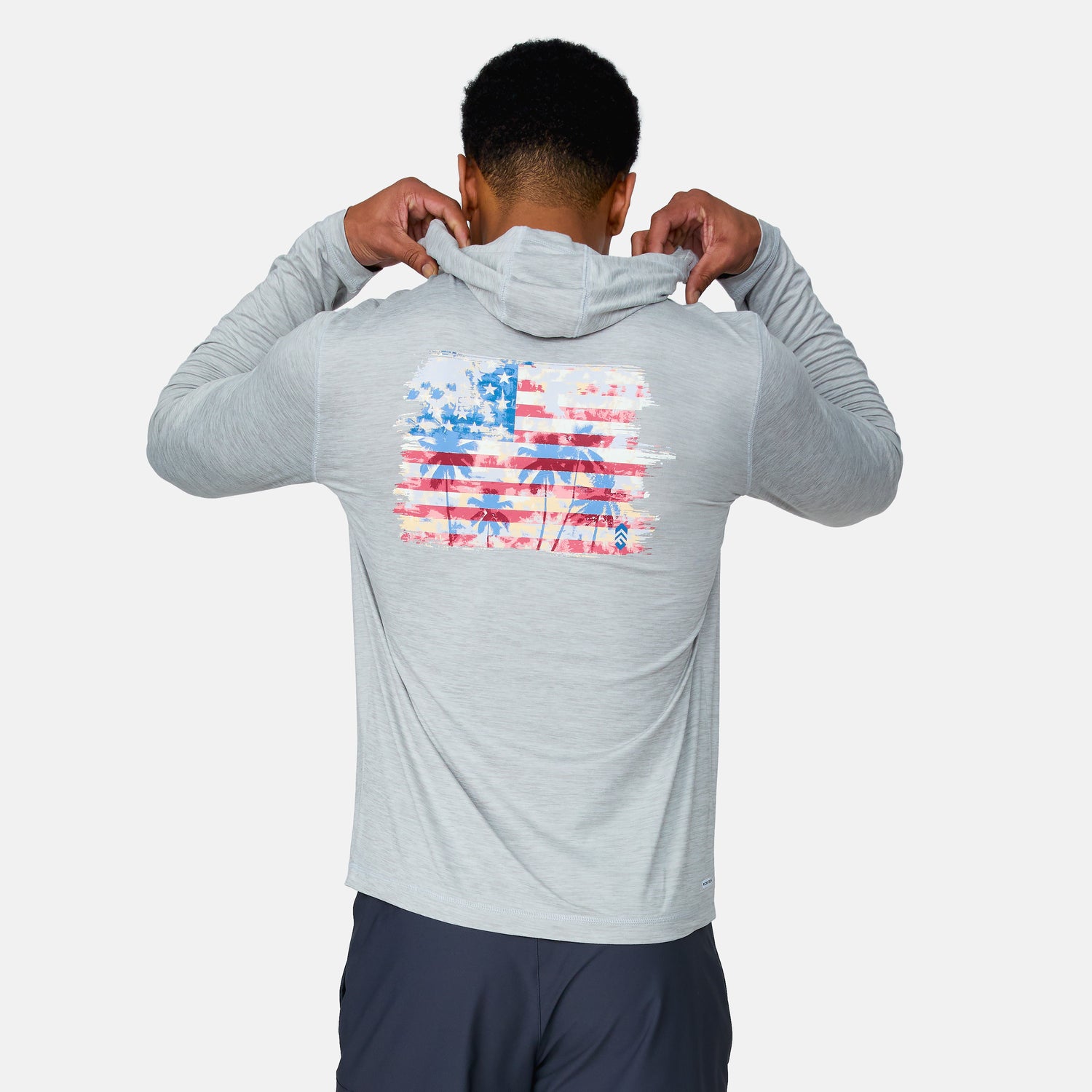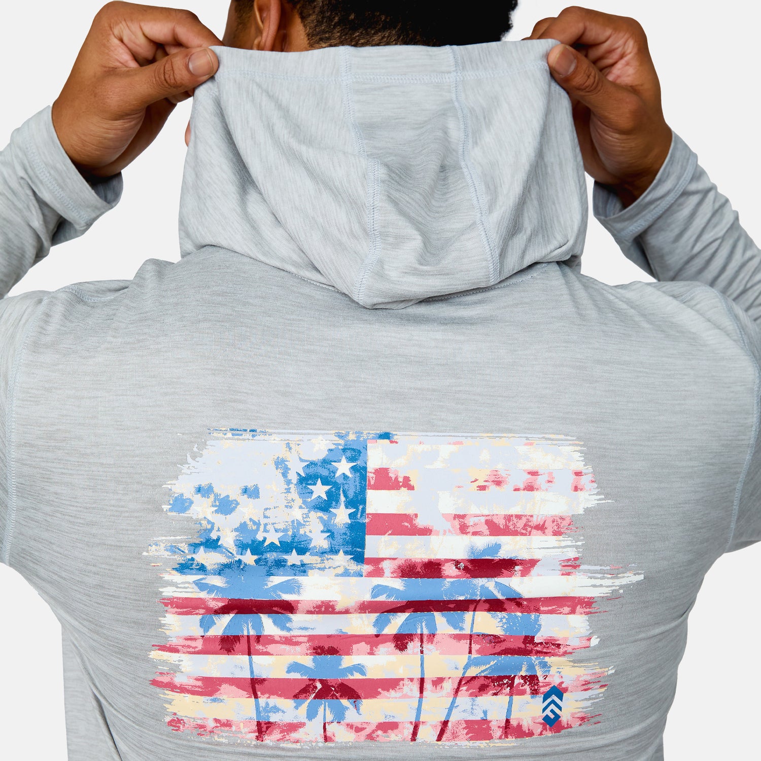 ![[Josiah is 6'3" wearing a size Medium.] Man wearing Free Country Men's Microtech® Hooded Graphic Sunshirt in Iron, size M, made from lightweight four way stretch performance fabric featuring an american flag design and upf, moisture wicking, and anti-odor technology, styled with navy shorts #color_iron](http://freecountry.com/cdn/shop/files/15LMAS5574FC2205IRON_2412_SS25-048-FC.jpg?v=1750704498&width=860)