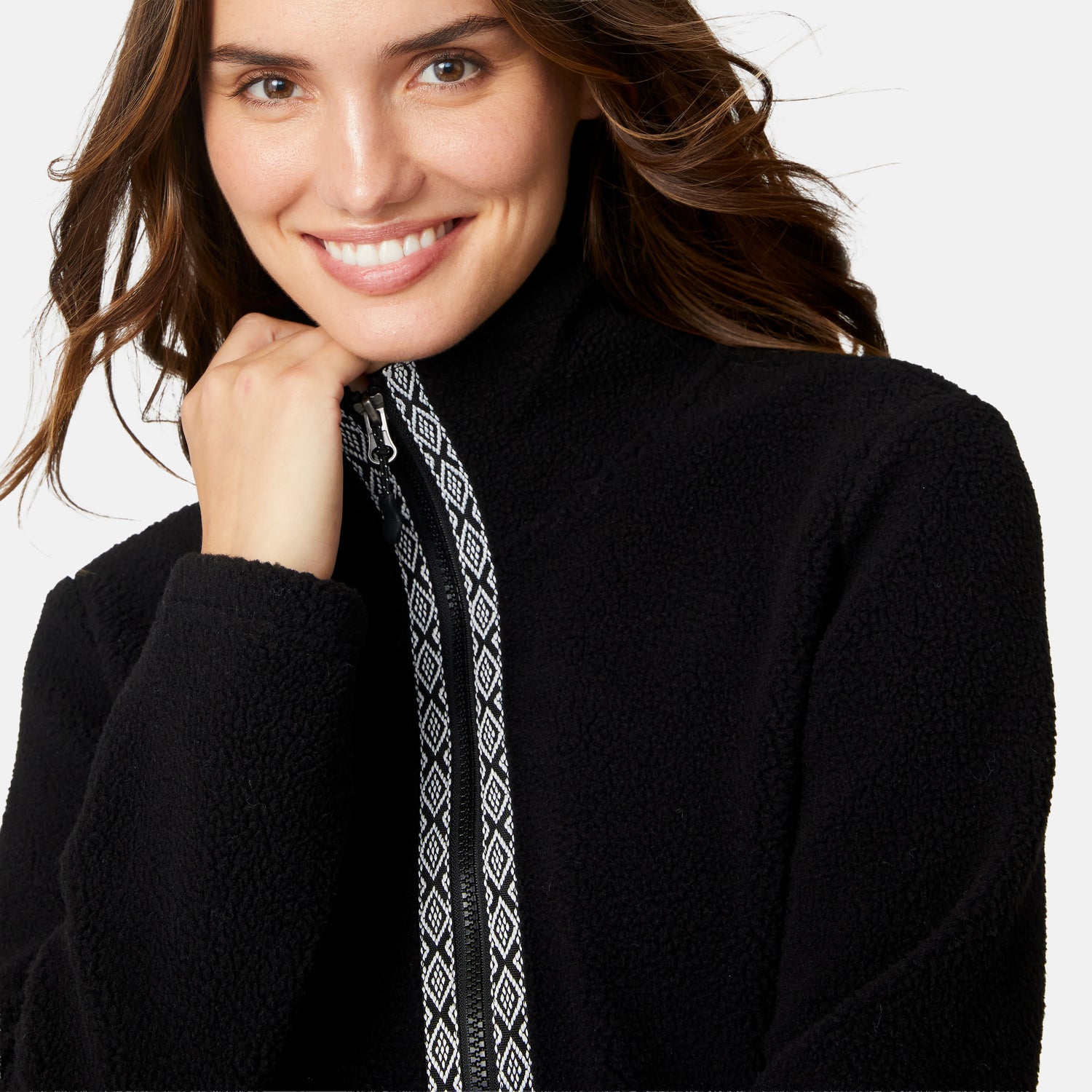 Made from 100% polyester, the Flex Sherpa Jacket features a plush, high-pile fleece that traps heat while remaining breathable—ideal for layering on chilly hikes, campfire nights, or weekend getaways. The high collar adds extra protection against the wind, while the patterned tape detail gives it a modern, outdoorsy flair.