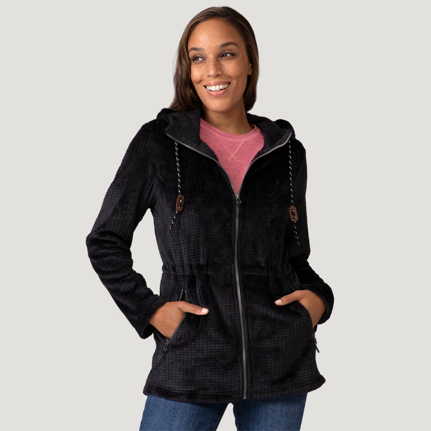 The attached hood with adjustable drawstring shields you from wind and drizzle, while the adjustable waist lets you customize the fit for a flattering silhouette. With lower zippered pockets to stash your essentials and a machine washable design for easy care, this fleece anorak is built for everything from mountain hikes to morning coffee runs.
