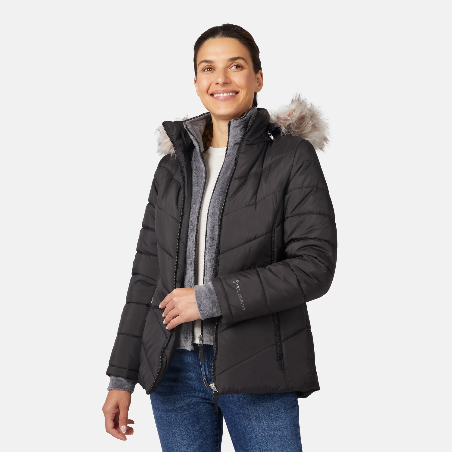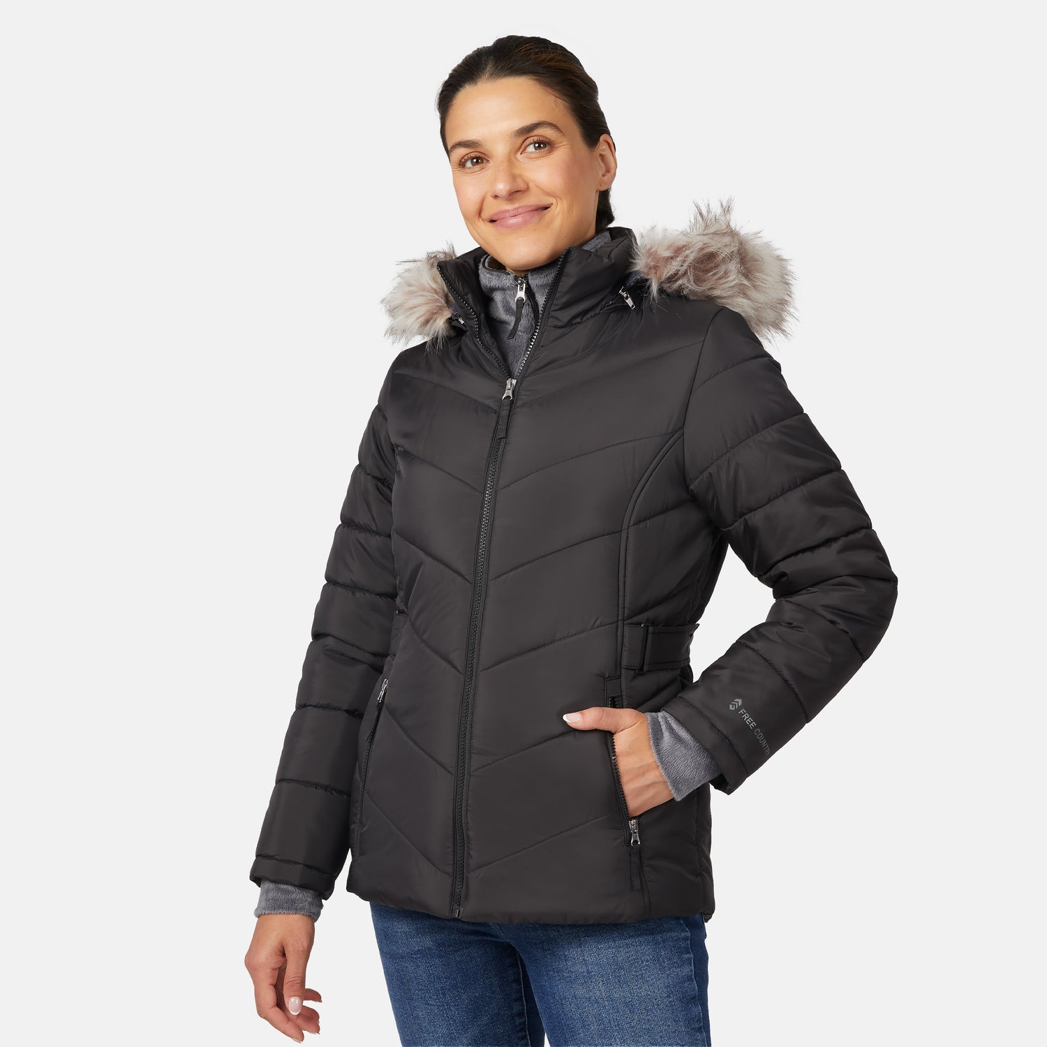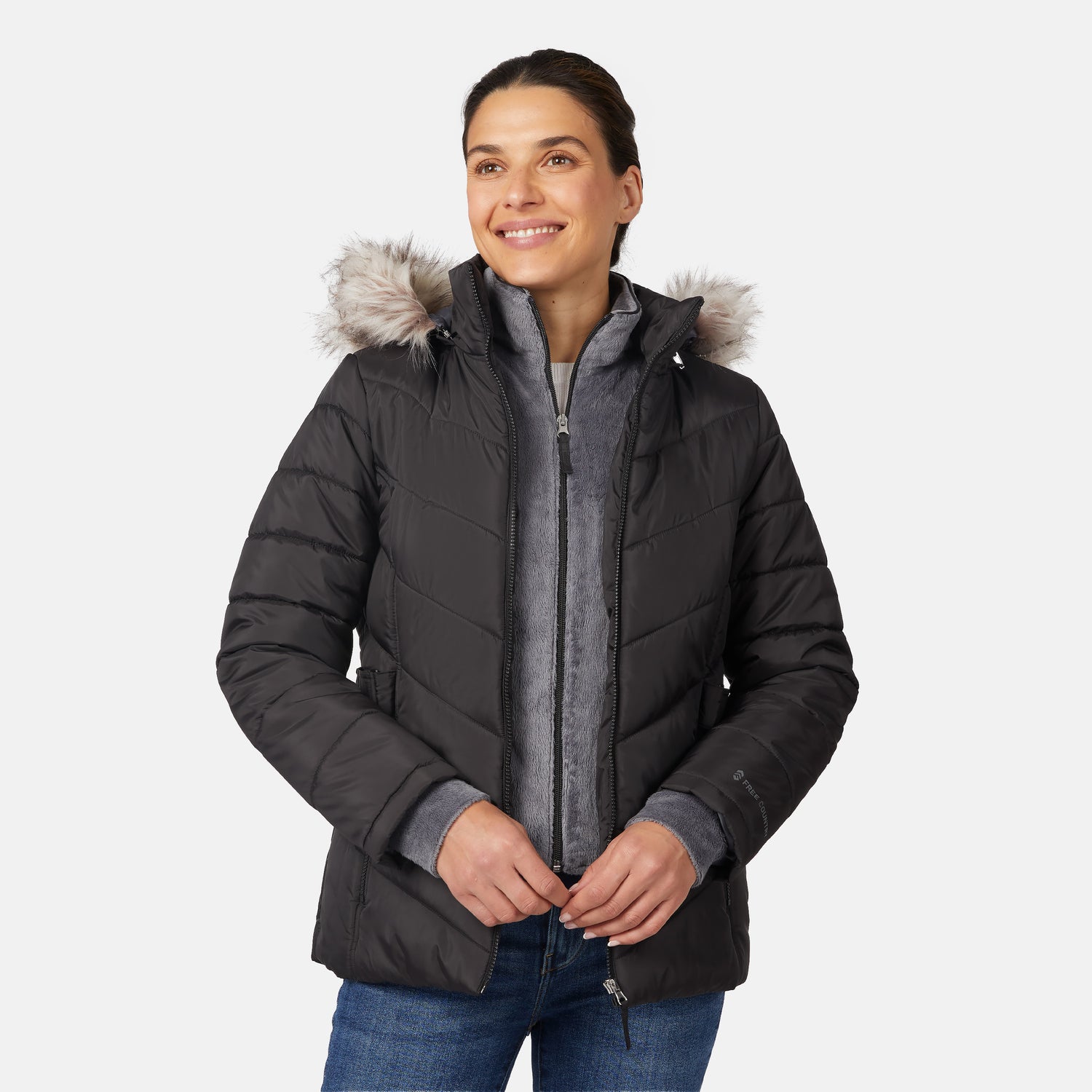 ![[Olga is 5'9" wearing size S.] Model wearing black quilted jacket with faux fur hood and attached bib ā layered warmth and stylish silhouette for winter outings](http://freecountry.com/cdn/shop/files/52LOF5725_BLACK_031_FC.jpg?v=1757709238&width=860)