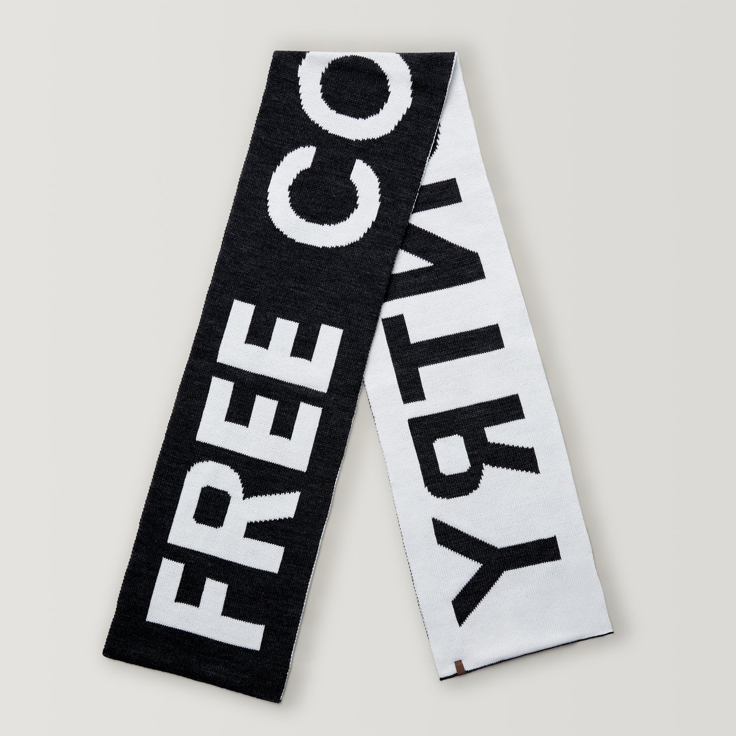 Wrap yourself up in style in comfort in this graphic scarf. The intarsia knitting reads "Free Country" in reversible black and white colors.