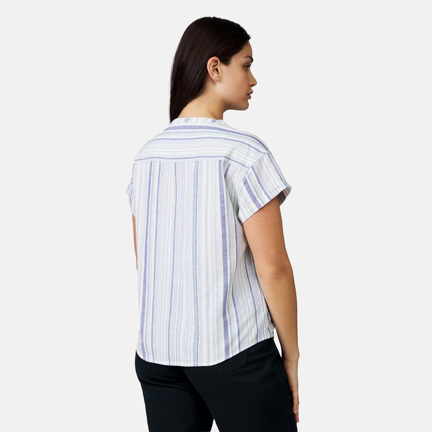 Say hello to your new warm-weather essential! Made from a soft cotton-linen blend with pastel stripes, this shirt is a breath of fresh air for your wardrobe. The V-neckline and button placket add a refined touch, while cuffed short sleeves keep things relaxed and effortless. Whether you're catching up with friends over brunch or packing for a weekend getaway, this easy-to-wear piece keeps you cool, comfortable and put-together. And the best part? It’s machine washable—because looking great should always be hassle-free.