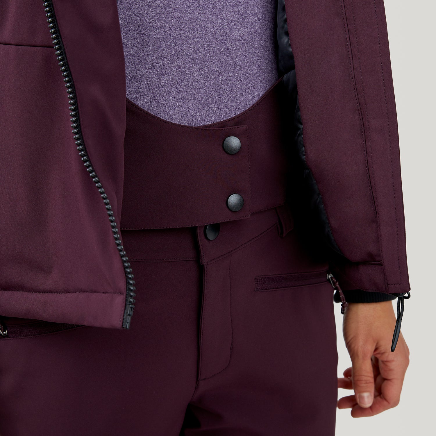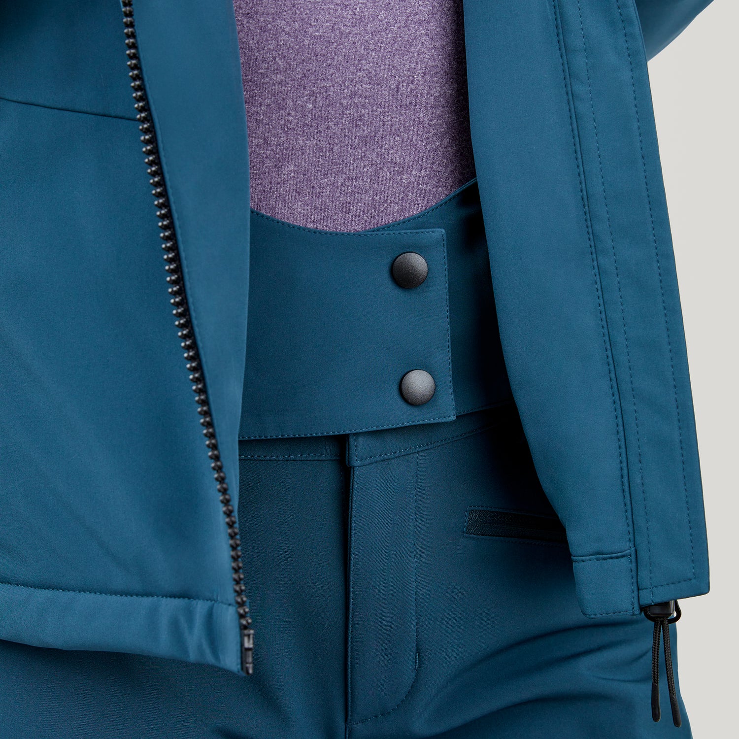 • Three layer bonded fabric consisting of: Poly spandex blend of high denier yarns, water resistant membrane, quilted interior lining