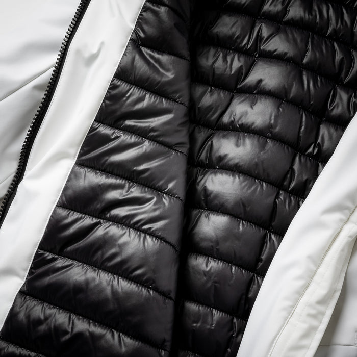 - Three layer bonded fabric consisting of: Poly spandex blend of high denier yarns, water resistant membrane, quilted interior lining