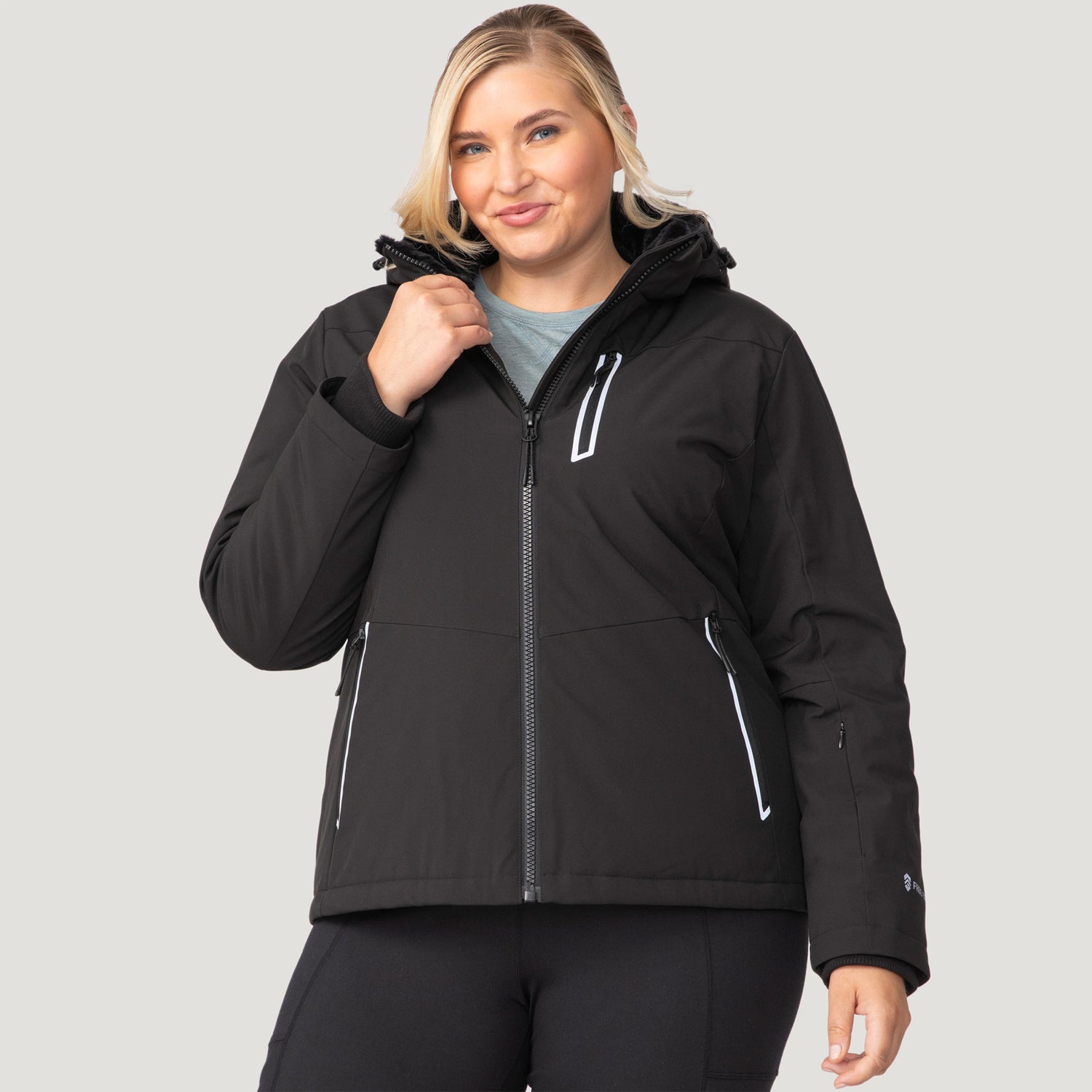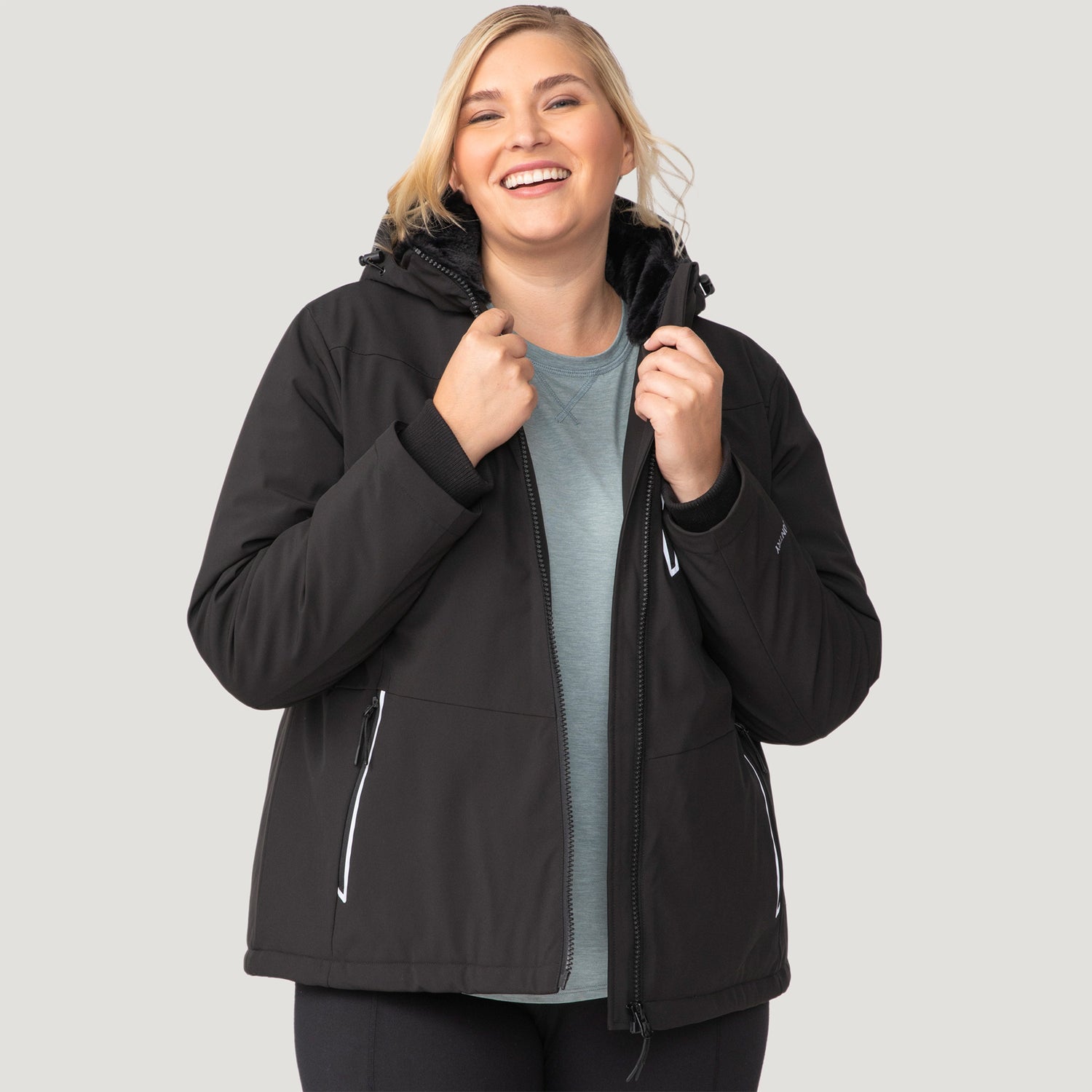 ![[Lola is 5'10.5" wearing a size 1X.] Woman wearing Free Country Women's Plus Size FreeCycle® Thermo Super Softshell® II Jacket in black with a full front zipper opening, lower pockets, soft lining, a detachable hood with an adjustable drawcord, and water resistant and wind resistant stretch performance fabric, light grey background. Best women’s jacket for winter weather.](http://freecountry.com/cdn/shop/files/14LOF4265XBLACK_2408_FW24-043.jpg?v=1759430466&width=860)