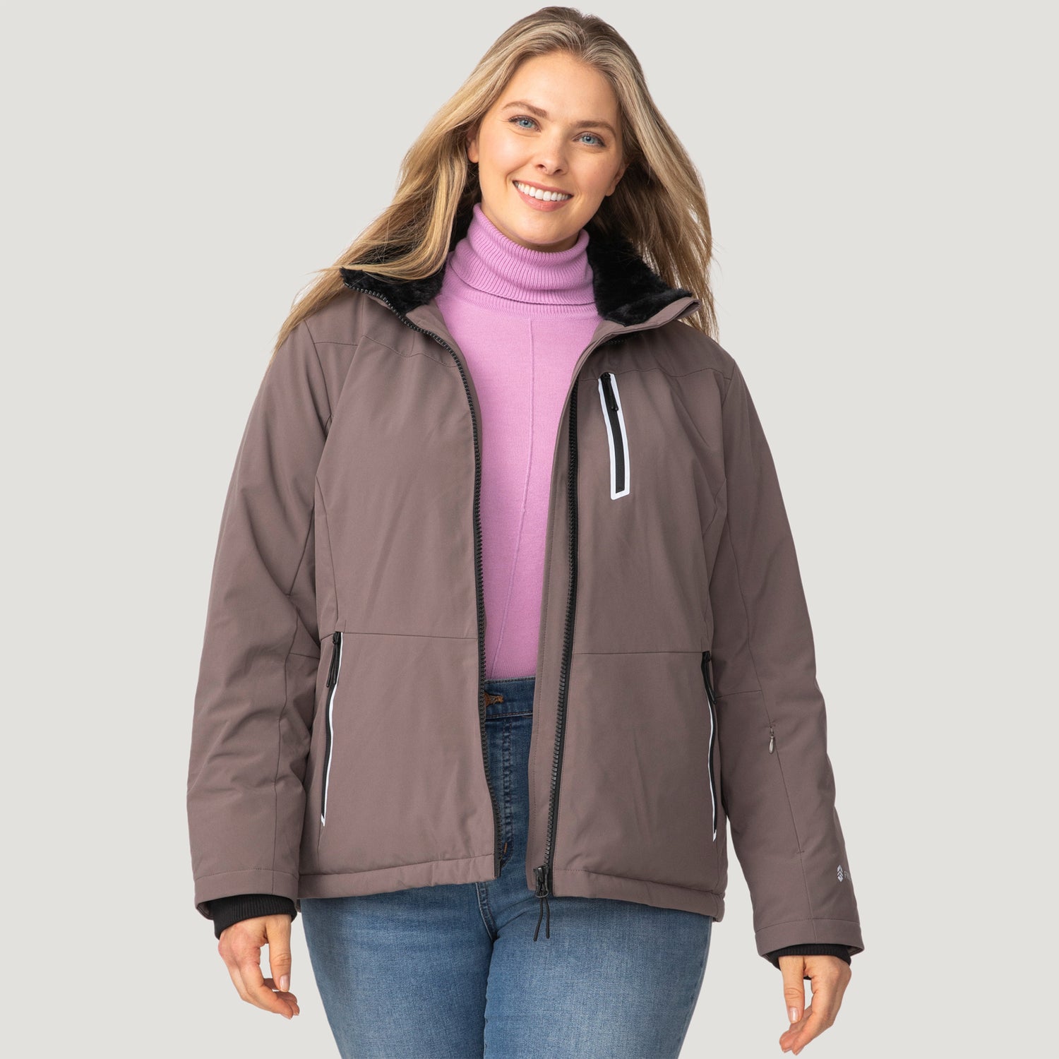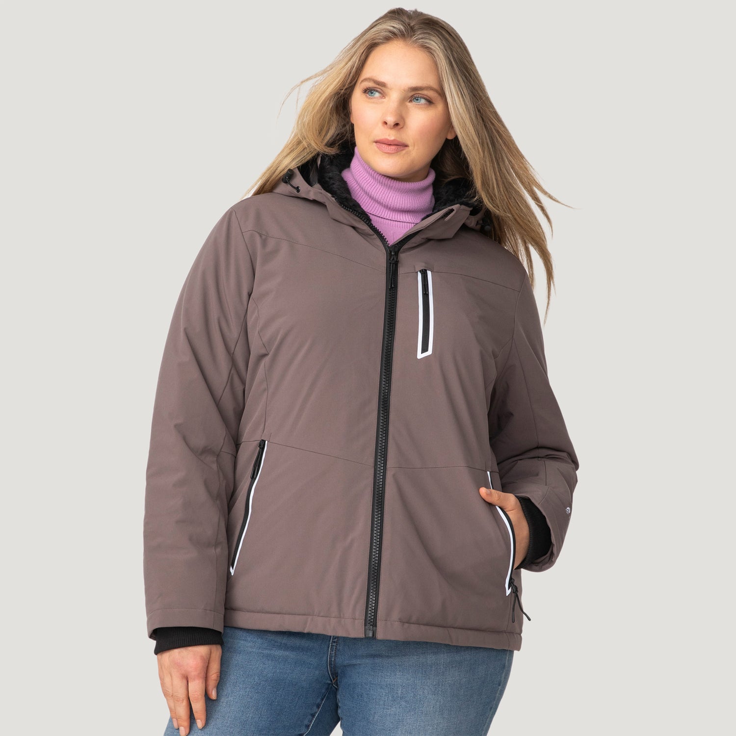 ![[Angela is 5'10" wearing a size 1X.] Woman wearing Free Country Women's Plus Size FreeCycle® Thermo Super Softshell® II Jacket in brown with a full front zipper opening, lower pockets, soft lining, a detachable hood with an adjustable drawcord, and water resistant and wind resistant stretch performance fabric, light grey background. Best women’s jacket for winter weather.](http://freecountry.com/cdn/shop/files/14LOF4265XDRIFTWOOD_2408_FW24-074.jpg?v=1759430466&width=860)