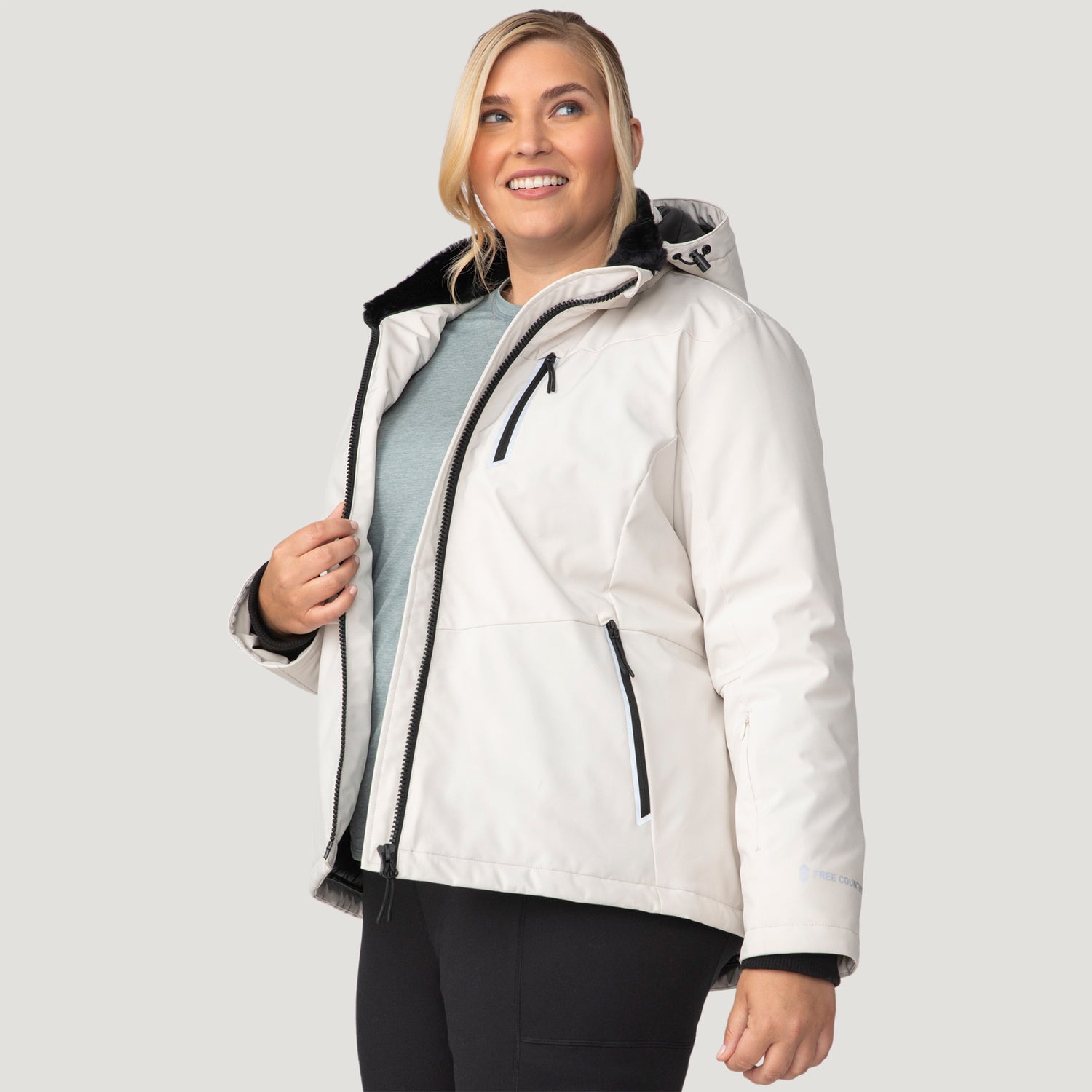 ![[Lola is 5'10.5" wearing a size 1X.] Woman wearing Free Country Women's Plus Size FreeCycle® Thermo Super Softshell® II Jacket in white with a full front zipper opening, lower pockets, soft lining, a detachable hood with an adjustable drawcord, and water resistant and wind resistant stretch performance fabric, light grey background. Best women’s jacket for winter weather.](http://freecountry.com/cdn/shop/files/14LOF4265XOYSTER_2408_FW24-024.jpg?v=1759430466&width=860)